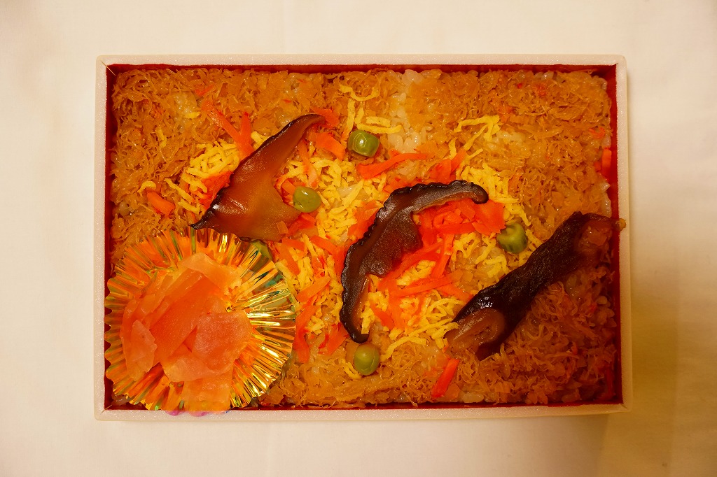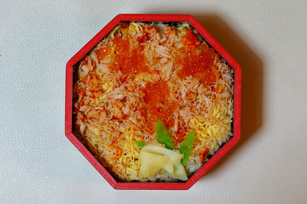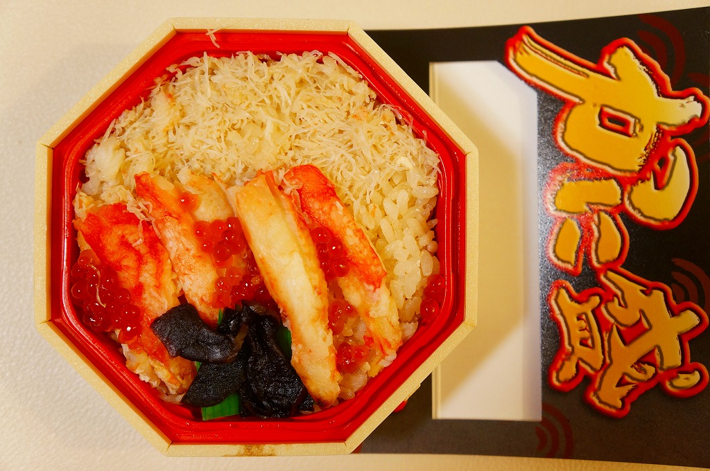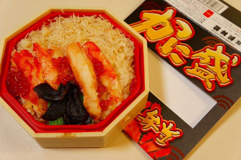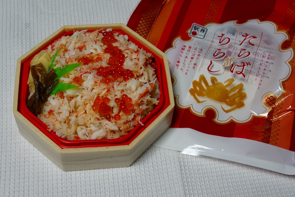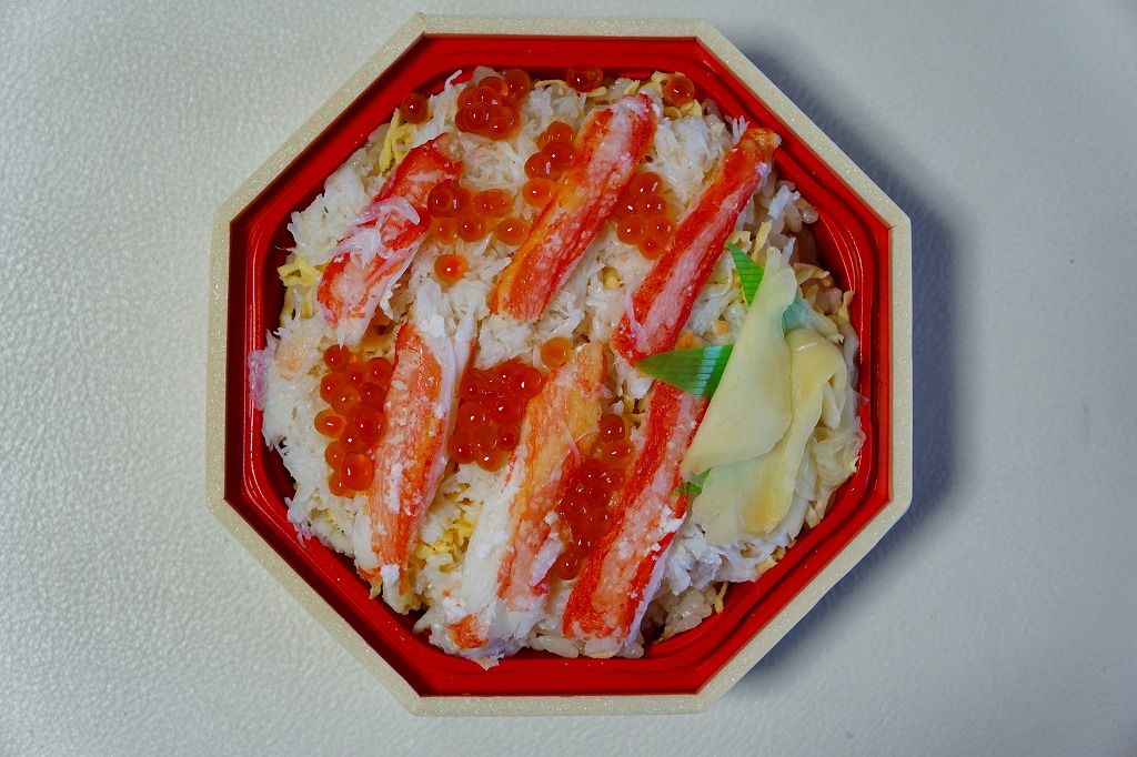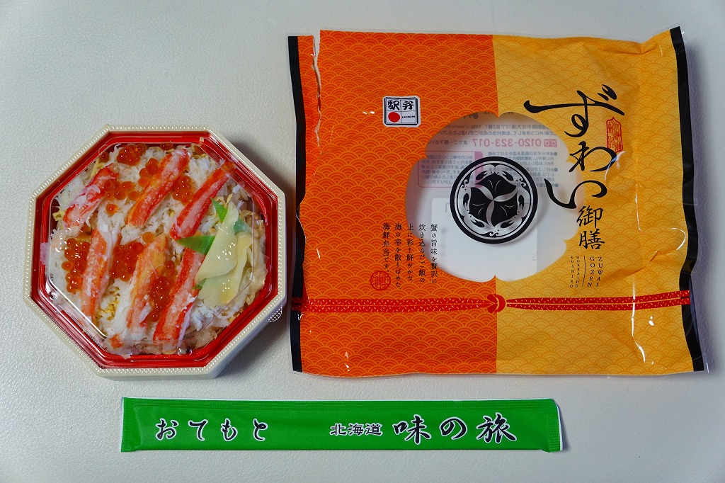2018(平成30)年1月の京王百貨店の駅弁大会で実演販売。正八角形の容器に茶飯を詰め、タラバガニのほぐし身で覆い、イクラで彩り、フキとガリを添え、透明なふたをして、フィルムの袋に密封していた。そんな姿は下記の「ずわい御膳」そっくり。最近の旭川駅弁と釧路駅弁の実演販売では、このような商品が見られる。2020年までの販売か。