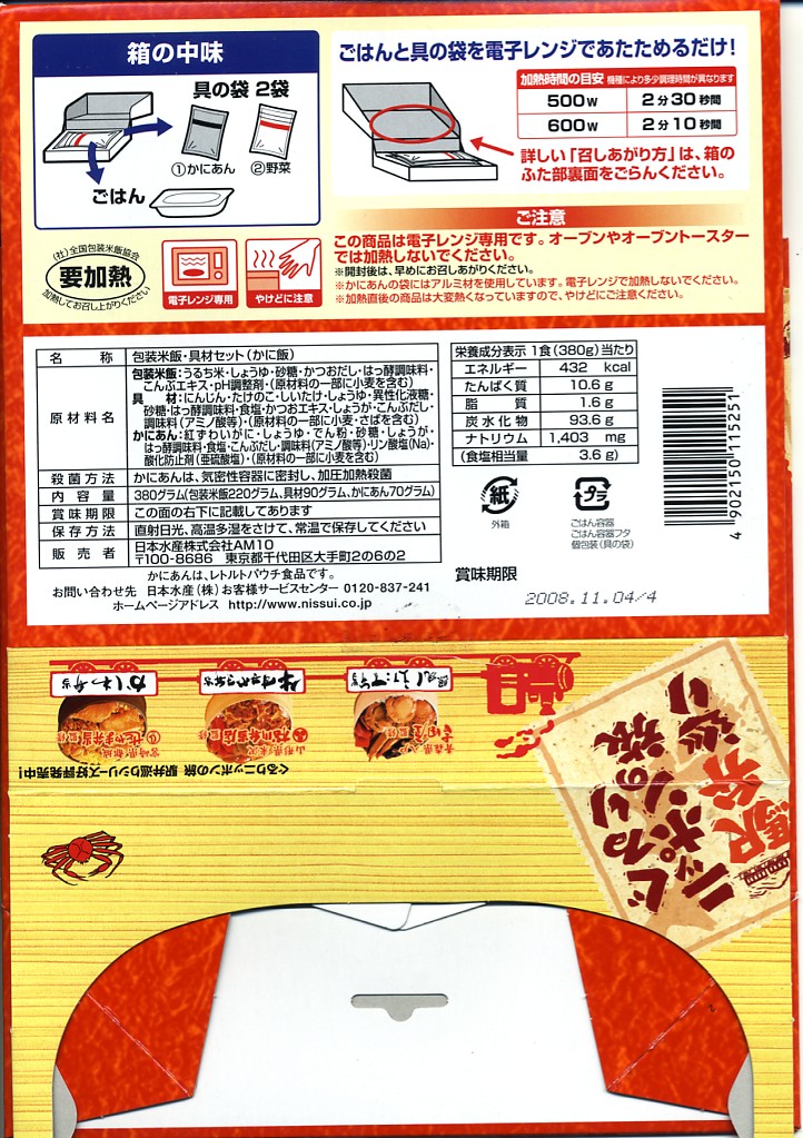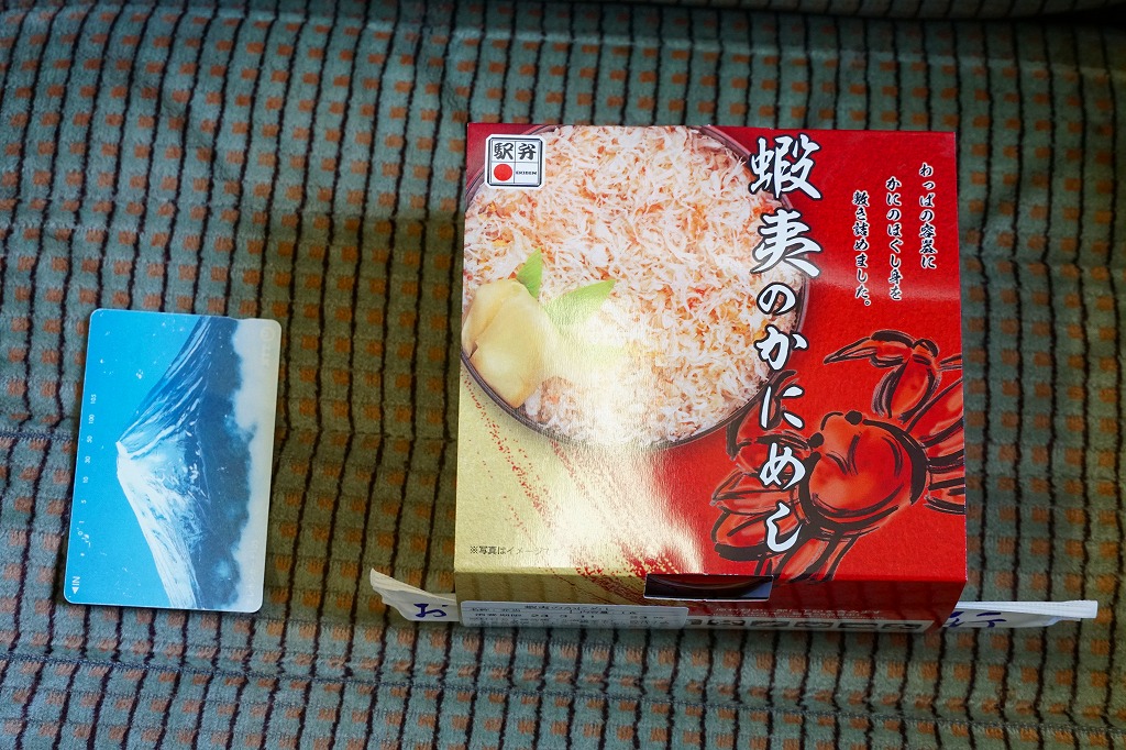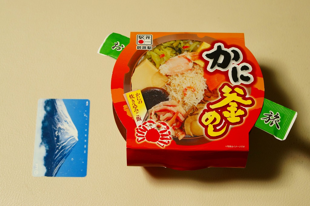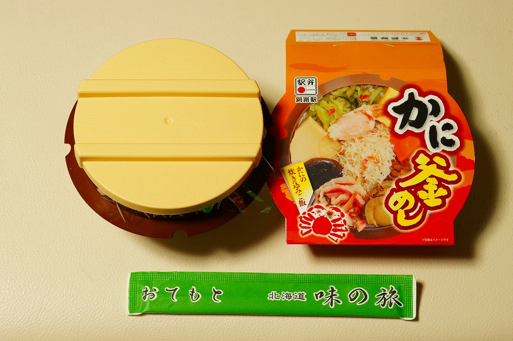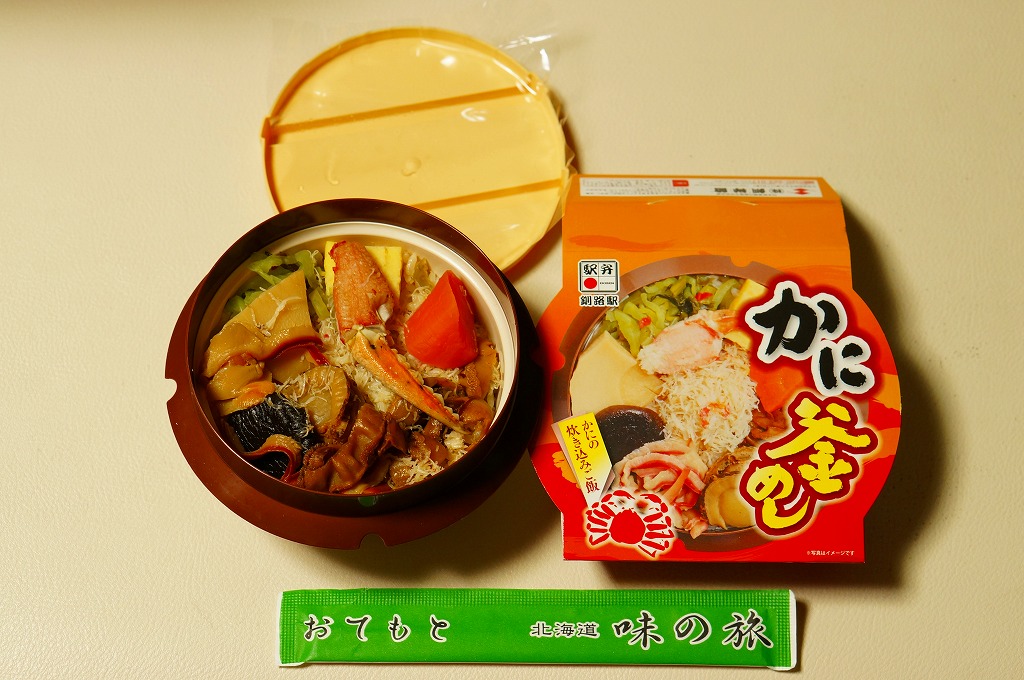秋冬の駅弁大会シーズンに向けた、2014(平成26)年秋の新商品か。駅弁の名前のとおり、プラ製の釜にカニの炊込飯を詰め、カニのハサミとほぐし身と、ホタテ、ホッキ貝、玉子焼、タケノコ煮、ニンジン煮などで覆うカニ飯。期待どおりの内容で、見た目にカニは少なくても、風味はカニ。今回はどうも1シーズンのみの販売だったようだが、同じような駅弁は今後も各地で何度も出てくるだろう。