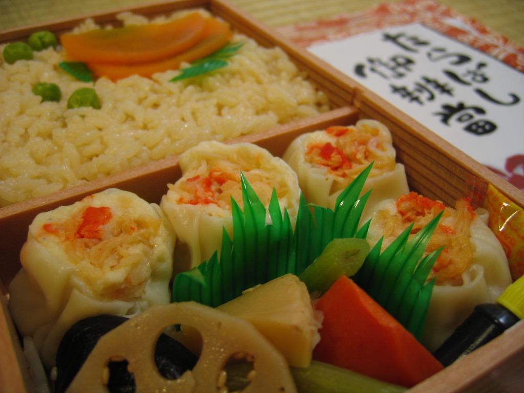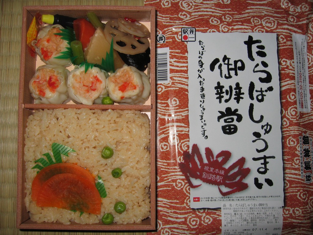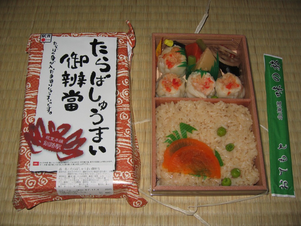 2006(平成18)年の秋頃に発売か。木目調にしては色黒な長方形の容器に透明なふたをして、商品名を書いた掛紙で包んで、ひもで十字にしばる。中身はグリーンピースの醤油飯にたらば焼売が4個、椎茸やフキなどの煮物に大根みそ漬など。焼売に見た目も風味も少々の値段相応なカニを感じるが、駅ではなく催事場で売るための弁当なのだろうなという風味も、中身や食品表示ラベルから感じられてならなかった。2012年までの販売か。