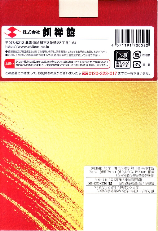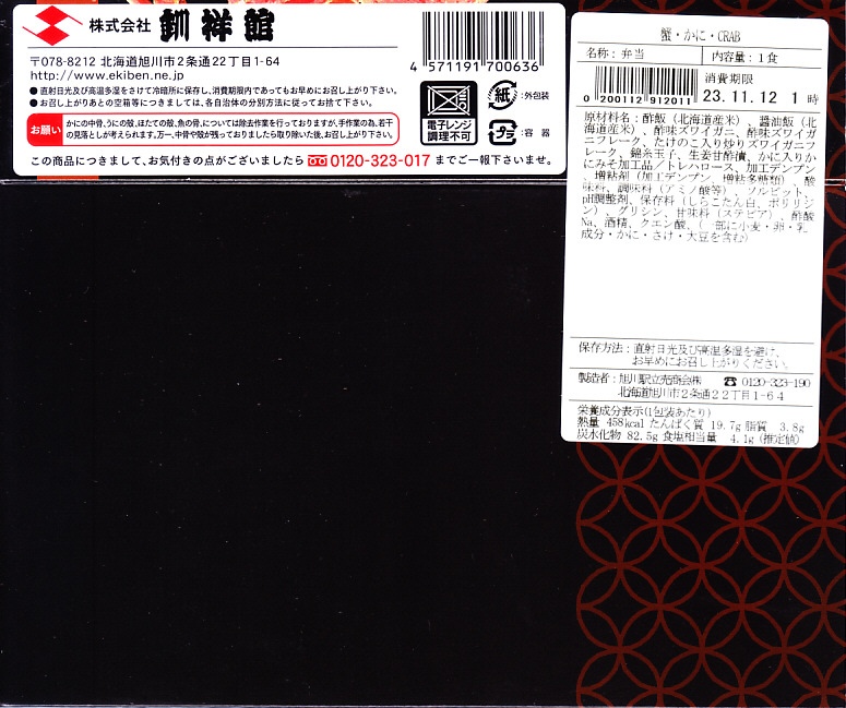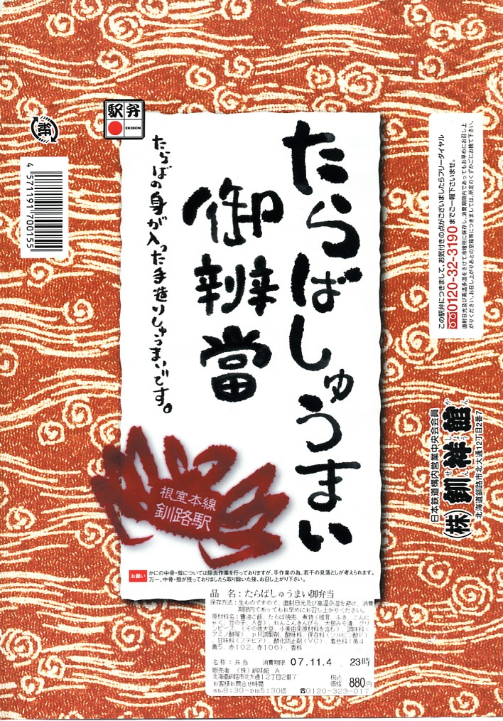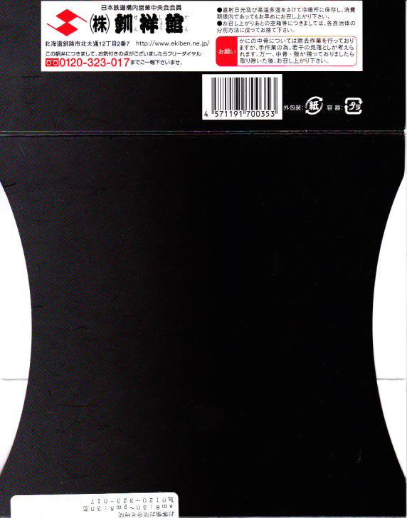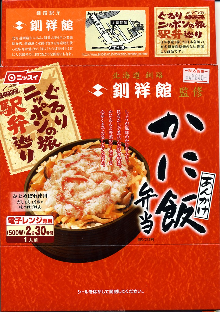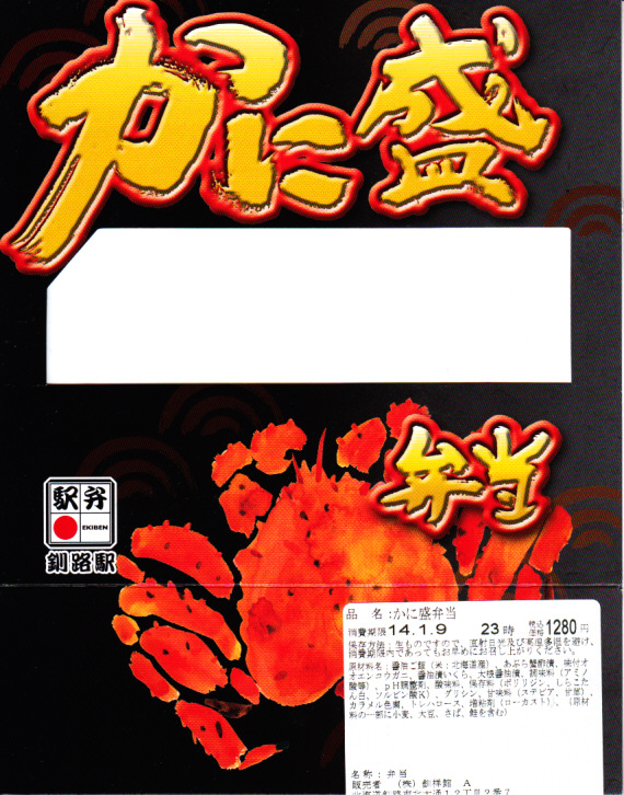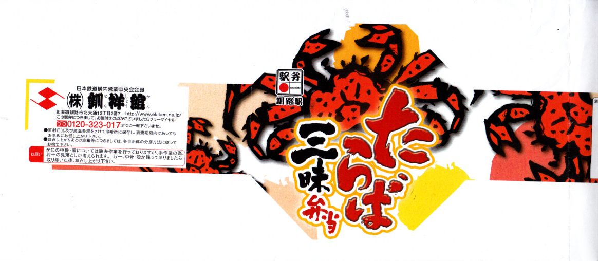 釧路駅の駅弁を名乗る、駅弁催事専用商品と考えられる。釧路駅で名物の駅弁「たらば寿し」の、酢飯を醤油飯に置き換え、サーモンを抜いたもの。ボール紙枠の小窓からは、カニ棒肉がどっさり見えたが、枠を抜いた八角形の容器には、カニほぐし身が薄ーく広がっていた。その後は釧路駅でなく旭川駅の駅弁として、相変わらず催事専用商品になっている模様。