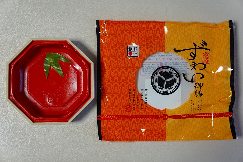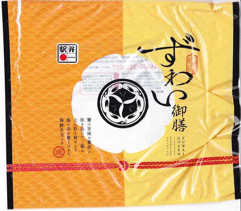 2017(平成29)年1月の京王百貨店の駅弁大会での実演販売でデビューか。駅弁の名前は「ずわい蟹御膳」とされることがある。正八角形の容器に茶飯を詰め、釧路は、小柄な正八角形の容器に茶飯を詰め、錦糸卵とカニほぐし身で覆い、カニ棒肉とイクラで彩り、ガリを添えて透明なふたをする。見た目どおりのカニ駅弁で、道内各地や北海道物産展でよく見るタイプの、催事向けな海鮮弁当。これを商品名や宣伝文を書いたビニール袋に詰めてシーリングする外装は、今までの駅弁にないもので、興味深いところ。価格は2017年の発売当時で1,150円、2018年時点で1,180円、2020年時点で1,290円。2020年までの販売か。