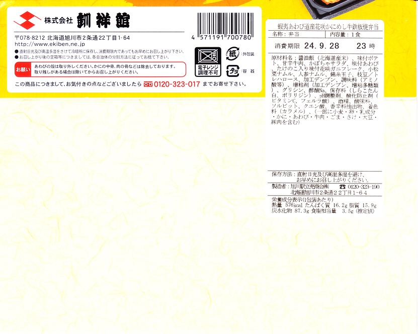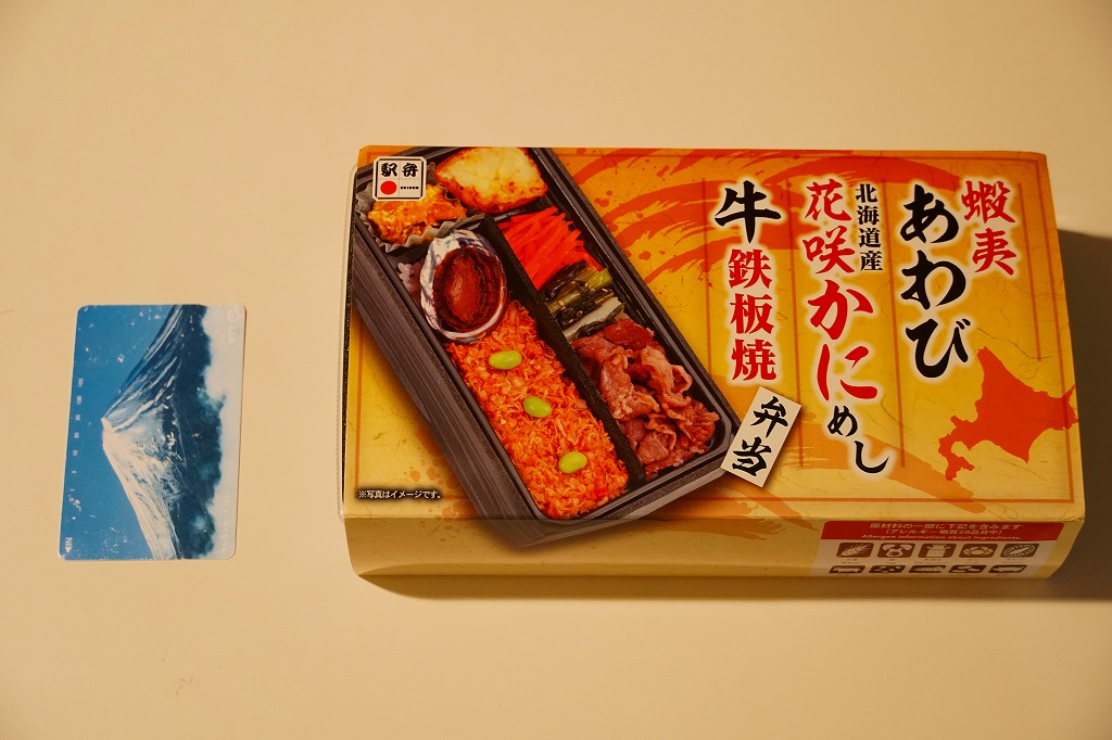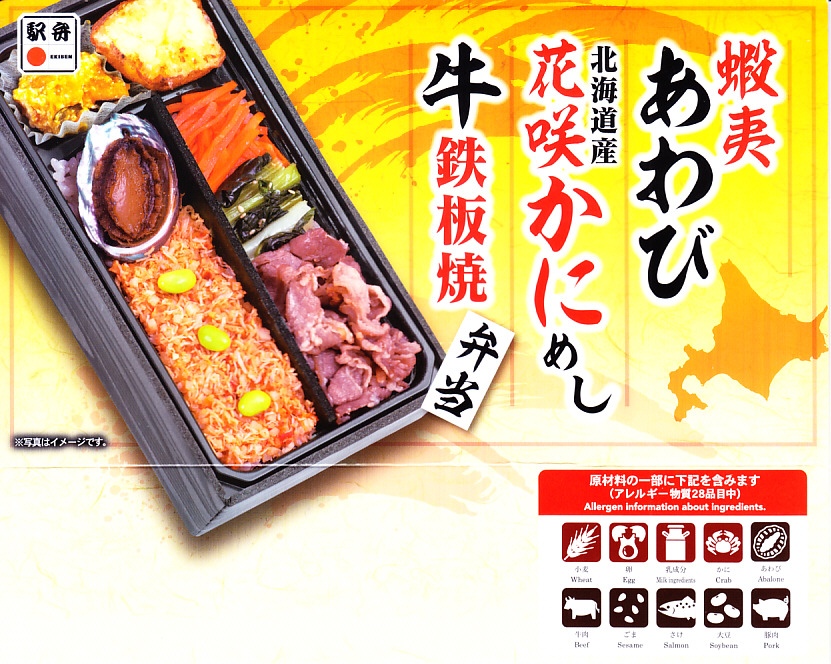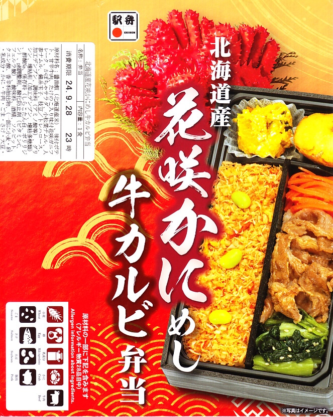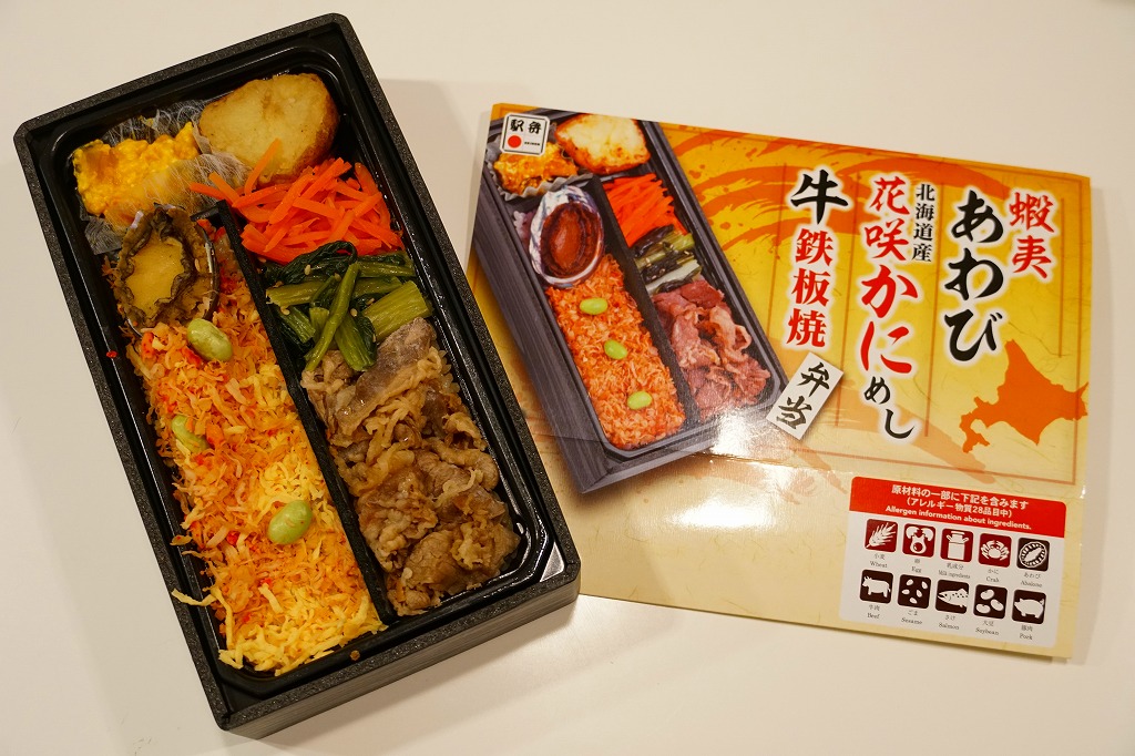 秋冬の駅弁大会シーズンに向けた、2024(令和6)年秋の新商品で、全国のスーパーの駅弁催事へ出荷。真っ黒な長方形のプラ容器で、醤油飯を細長く2列に敷き、一方をタケノコ入りカニフレークと枝豆で、他方を牛肉と小松菜と人参で覆い、ポテトサラダとカボチャサラダを添えるのは、スリーブの写真そのまんま。これは同じ日に同じ場所で買った上記の「蝦夷あわび北海道産花咲かにめし牛鉄板焼弁当」の、商品名と中身から蝦夷あわびを抜いたものではないか。それなのに値段が変わらないのは、おそらく牛鉄板焼を牛カルビに格上げして相殺したか。常温で食べれば同じ駅弁。