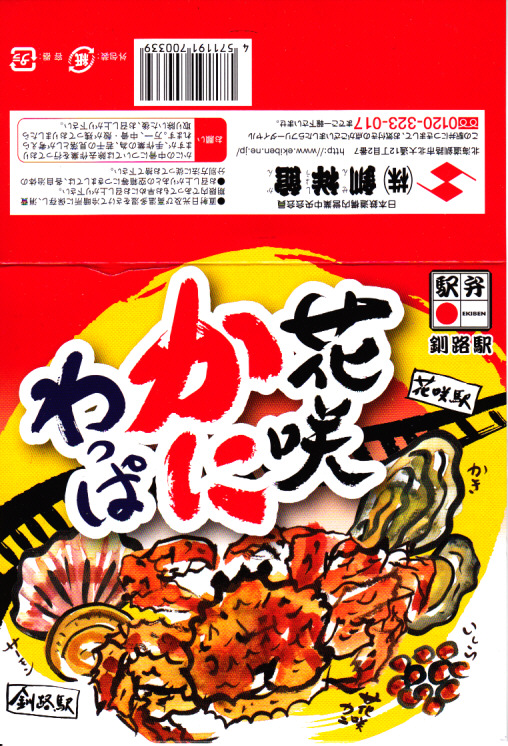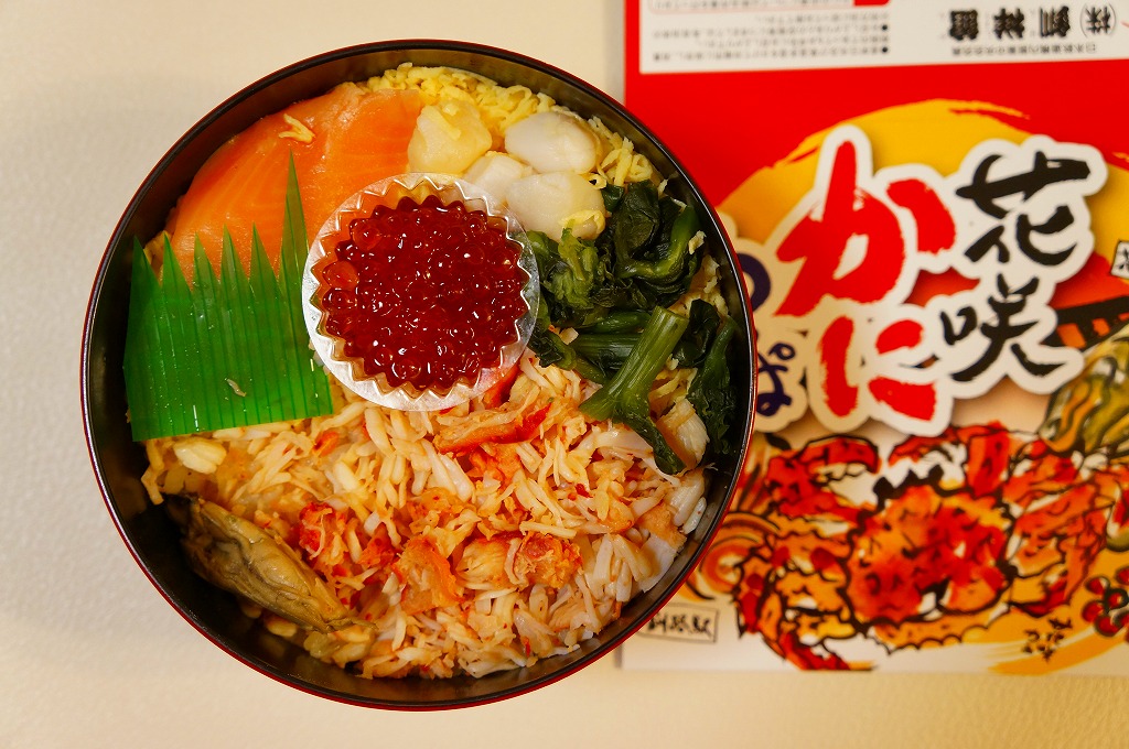 秋冬の駅弁大会シーズンに向けた、2013(平成25)年秋の新商品か。現地で売らない疑義駅弁と考えられる。丸くて固いプラ製の容器に醤油飯を詰め、ハナサキガニのほぐし身、ホタテでなくイタヤガイの酢漬け、サーモン、カキ、菜の花、錦糸卵で覆い、イクラ醤油漬のカップを添える。ハナサキガニの荒いフレークのキュッキュとした食感が好きです。パッケージには「釧路駅」とともに「花咲駅」と書いたが、花咲駅で駅弁が売られることはないと思う。