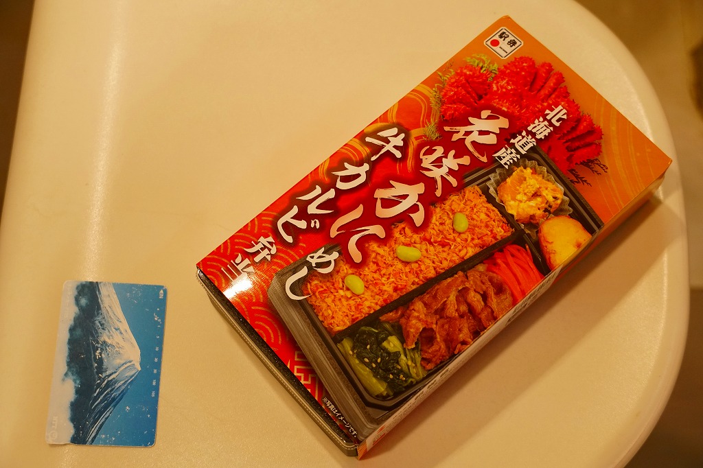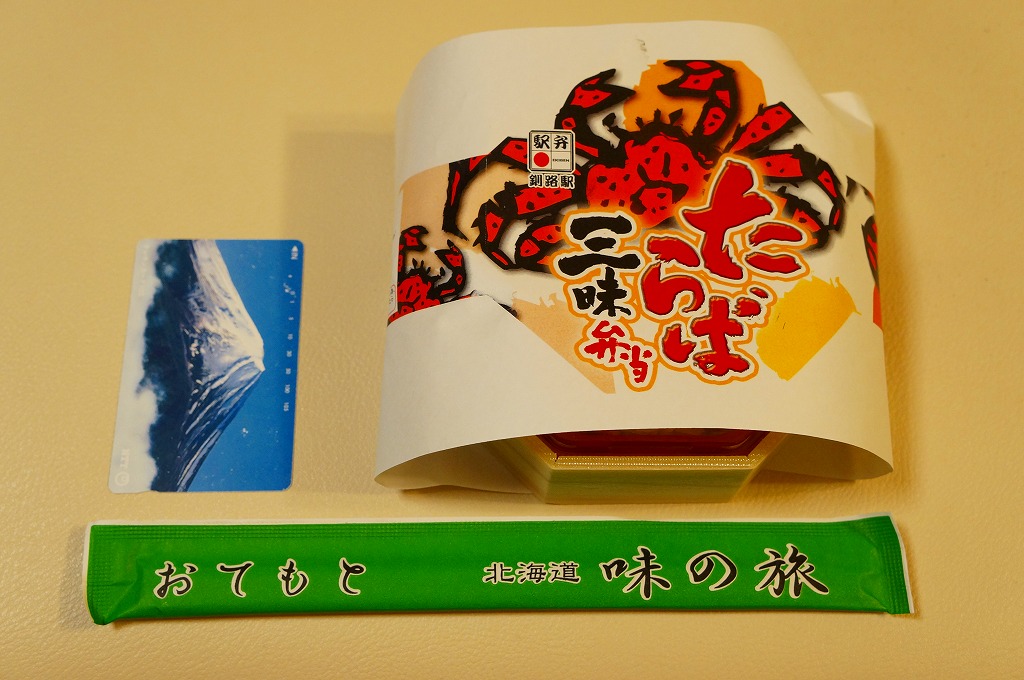 秋冬の駅弁大会シーズンに向けた、2023(令和5)年秋の新商品か。駅で売ったり駅弁大会に出てくる稚内駅弁と同じ、長方形容器の4区画すべてに、酢飯や醤油飯を詰め、かに棒肉と錦糸卵とガリ、酢味ほぐし身と錦糸卵、炒りがにとタケノコ、肩肉とかにみそで、やはり4区画すべてにズワイカニを載せる。カニの文字と絵柄と中身の写真が賑やかなスリーブほどでなくても、カニをいろんな姿で詰めているから、都会での駅弁催事に向きそう。実際にこれも東京駅で買ったし、きっと釧路駅よりも売れる個数は多いと思う。