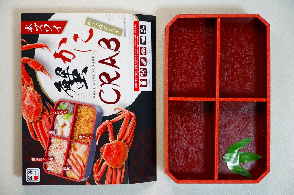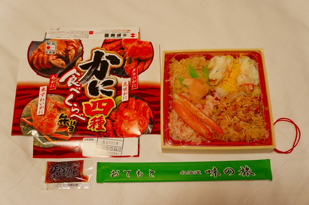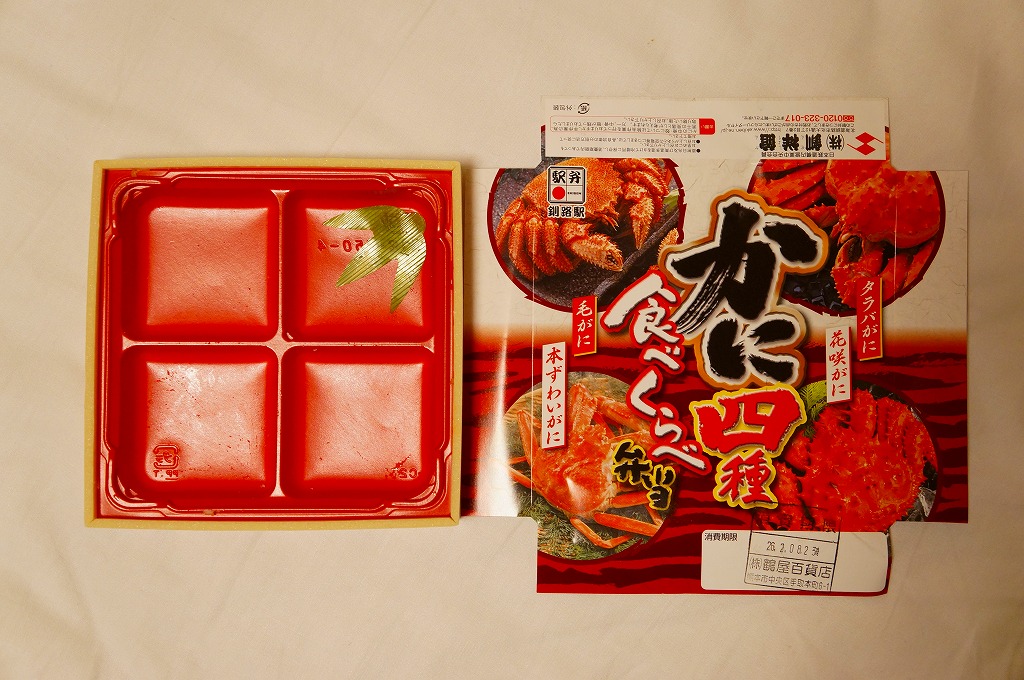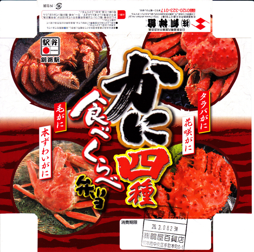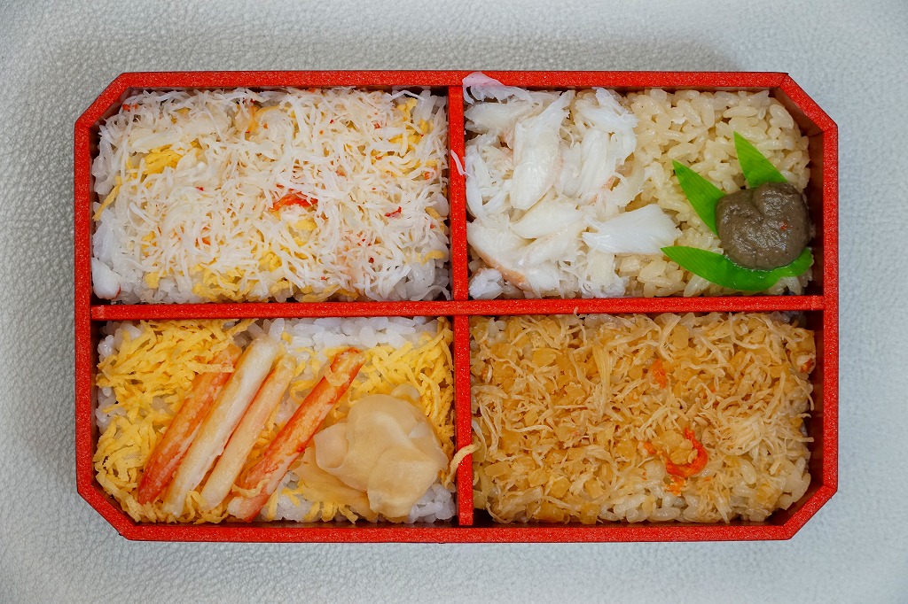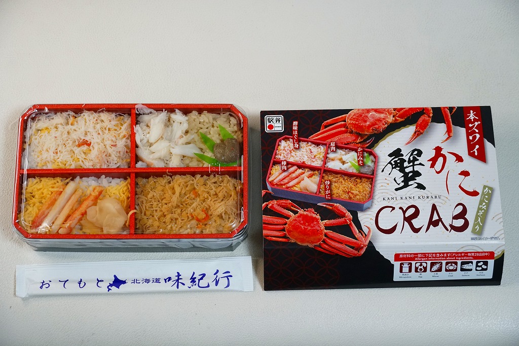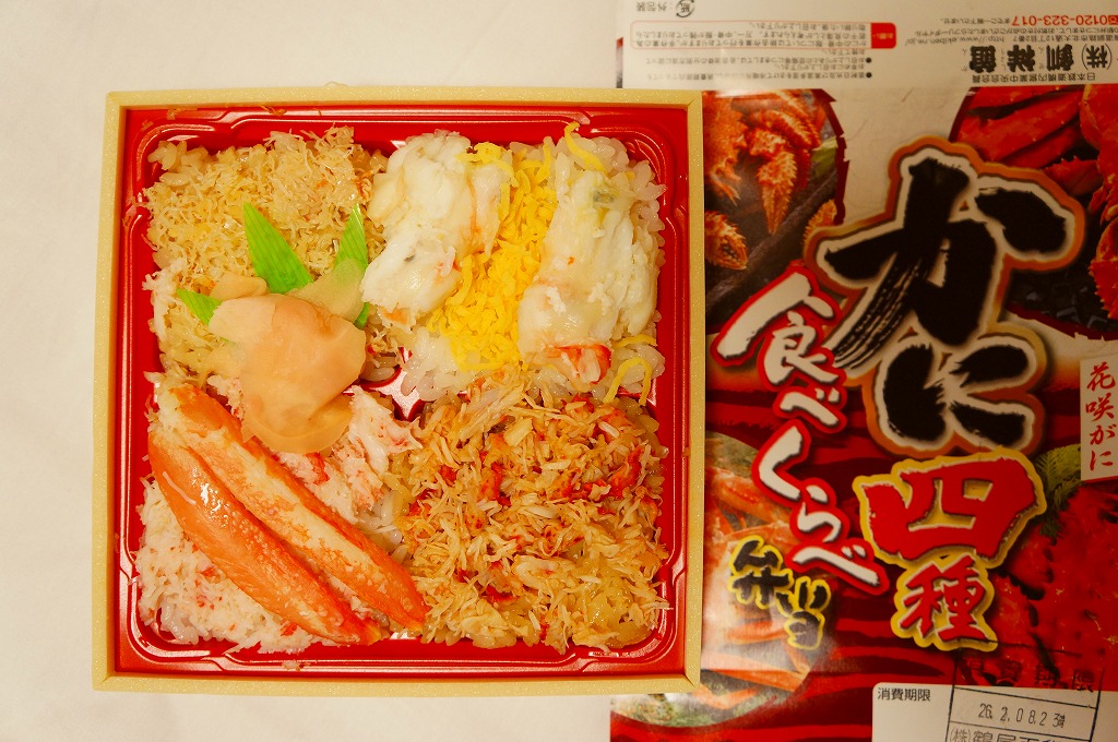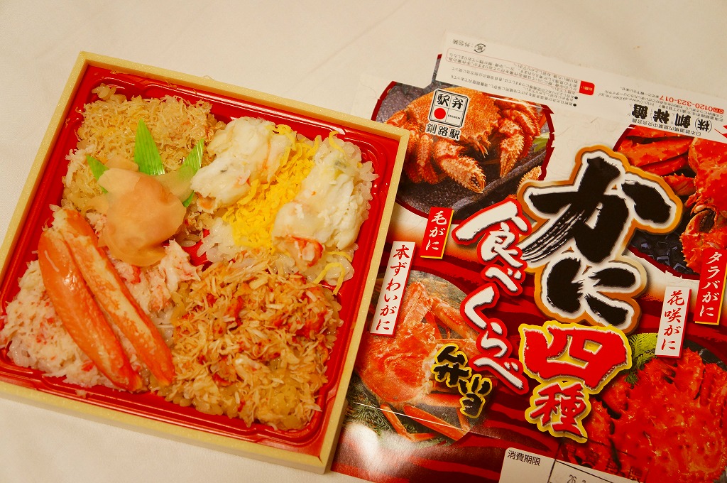 2014(平成26)年2月の鶴屋百貨店の駅弁大会でのみ販売か。容器の4区画に、茶飯をケガニの醤油フレークで覆う毛がに丼、酢飯をズワイガニの脚肉とほぐし身で覆うズワイガニ丼、茶飯をハナサキガニの醤油フレークで覆う花咲がに丼、酢飯をタラバガニのブロックと錦糸卵で覆うタラバガニ丼が同居。旭川駅や稚内駅の駅弁でも、百貨店の北海道催事でも、よく見られるタイプのカニ弁当。