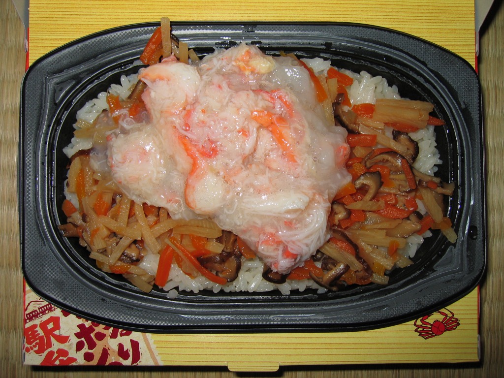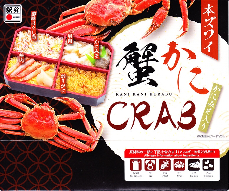 底の浅い長方形の容器の全体に、カニの味付け御飯を敷き詰め、その上に水分を飛ばしたカニの身を敷き、椎茸3切れに錦糸卵と紅生姜を散らして完成。味の刺激が強い紅生姜が、カニの風味を消しそうに見えて、食べれば逆にカニの味の引き立て役をうまく演じているようで、紅生姜が苦手でも食べられた。価格は2002年の購入時で850円、2010年時点で810円、2014年時点で840円、2018年時点で980円、2023年時点で1,080円。