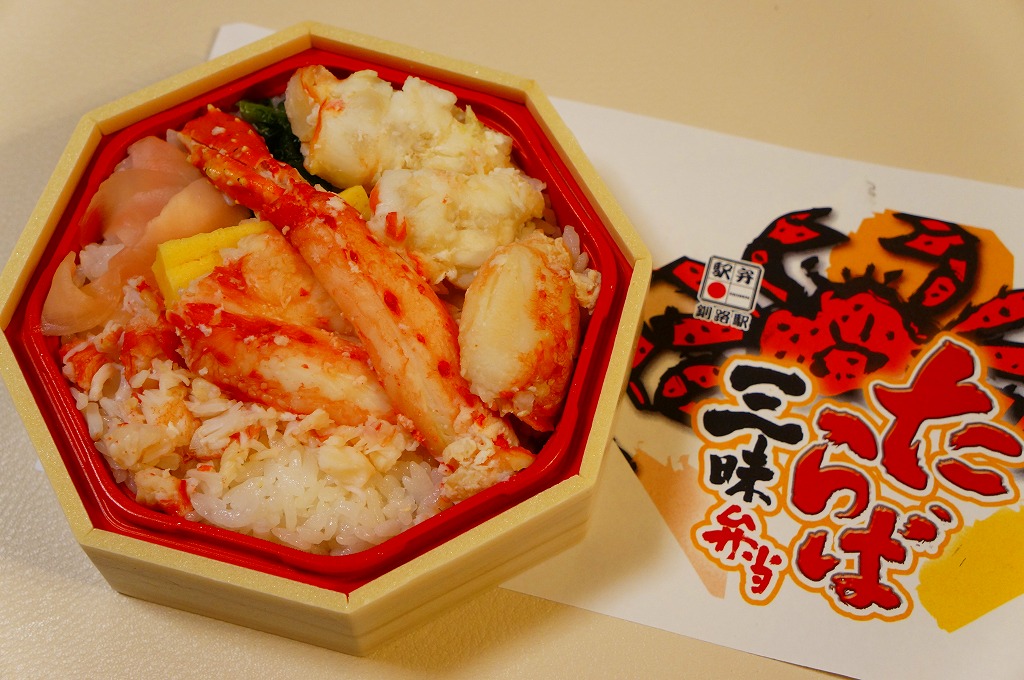 2014(平成26)年1月と、2015(平成27)年1月と、2016(平成28)年1月の京王百貨店の駅弁大会で実演販売。2015年と2016年の鶴屋百貨店の駅弁大会でも同様。これ以外の場所では売られていないのではないかと思う。正八角形の容器に酢飯を詰め、タラバガニのほぐし、ブロック、脚、棒肉で厚く覆う姿は、前世紀からの釧路駅弁「たらば寿し」に似ているカニ三昧。照りが強くないことと、上げ底をせず上げ蓋も軽いことで、掛紙の使用も含めて、より駅弁らしい体裁を持っていた。京王百貨店の駅弁大会では販売個数で3位に付ける人気。そんな評価とこんな内容であれば、釧路駅でも売れそうなものなのだが。2017年には出なかった。
