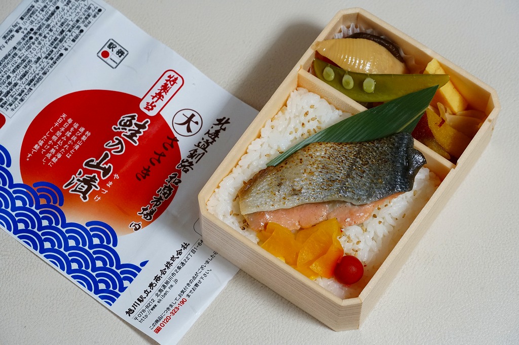 長方形の容器に、鮭を描いた秋色の掛紙をかける。中身は対角線で二分割され、一方に白御飯を敷き焼鮭を1切れ載せ、もう一方にエビや煮ホタテやホタテフライに筋子や玉子焼などを詰める。鮭は北海道でなくてもありふれた食材なので、つまりこれは幕の内駅弁なのだが、塩味の効いた大きなシャケの存在感と風味が好評だとか。現存しない模様。
