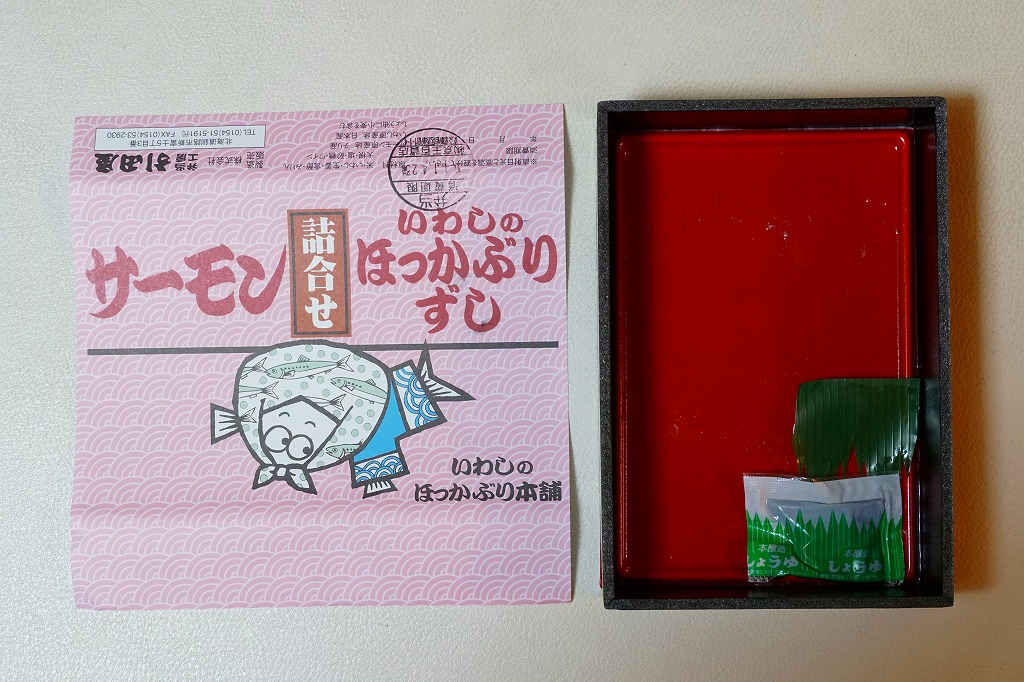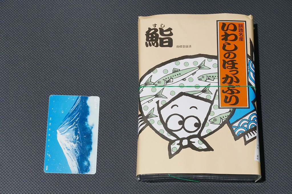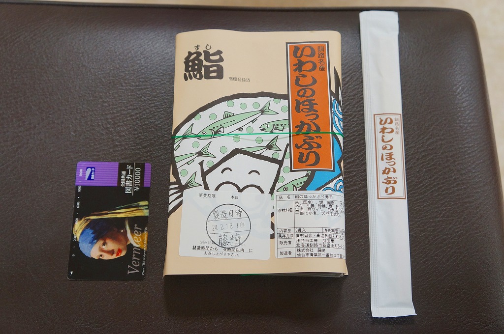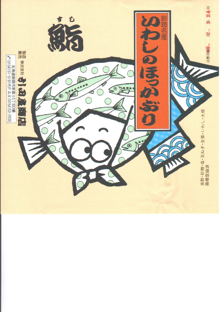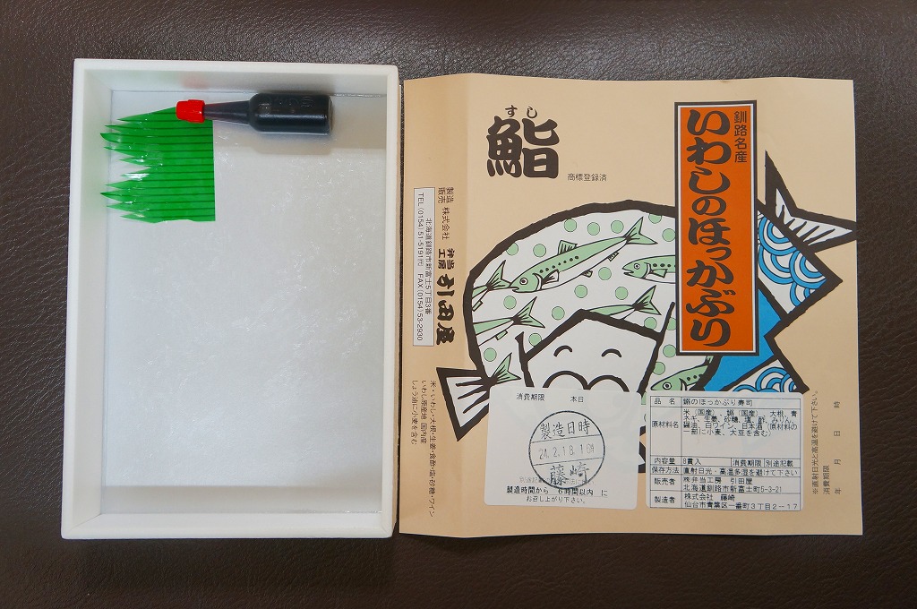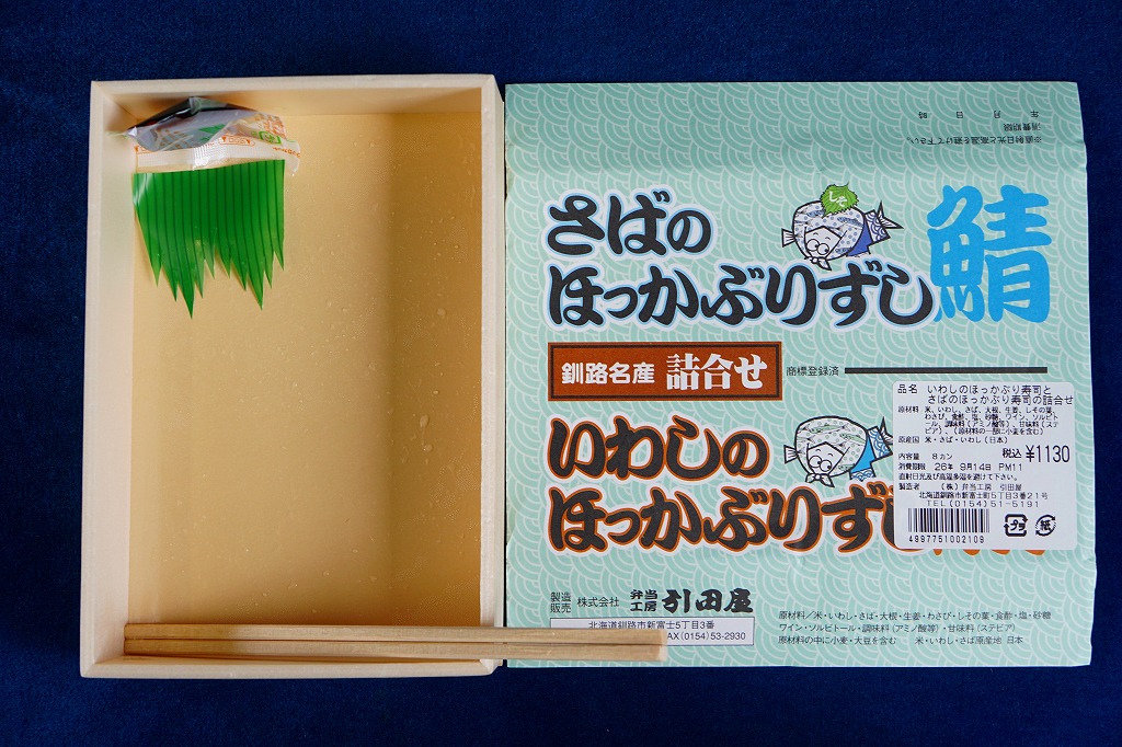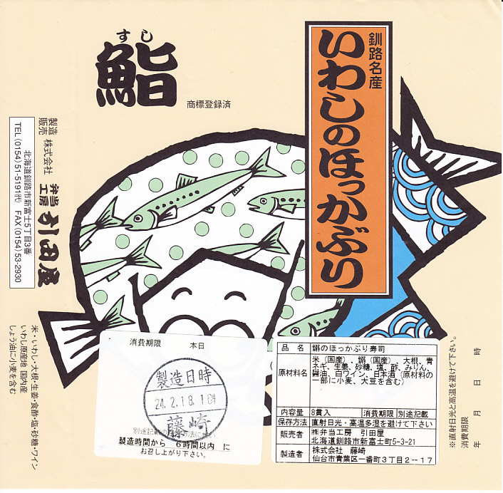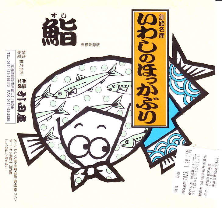2014(平成26)年9月14日に購入した、釧路駅弁の掛紙。駅弁の名前は食品表示ラベルから。絵柄は上記の2023年のものと、まったく同じ。イワシとサバのほっかぶり寿司について当時は、あるいは現地では、通常版の「いわしのほっかぶり」とは掛紙を使い分けていた。