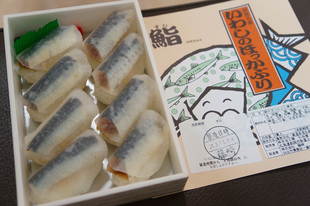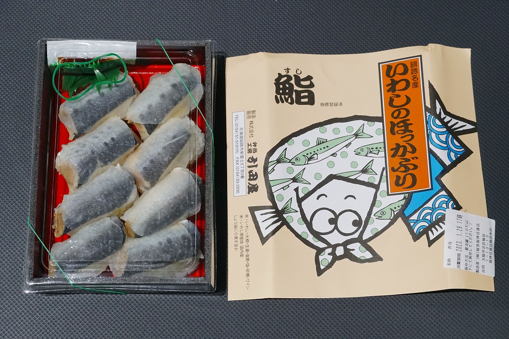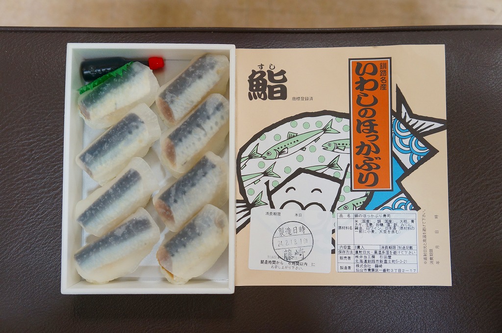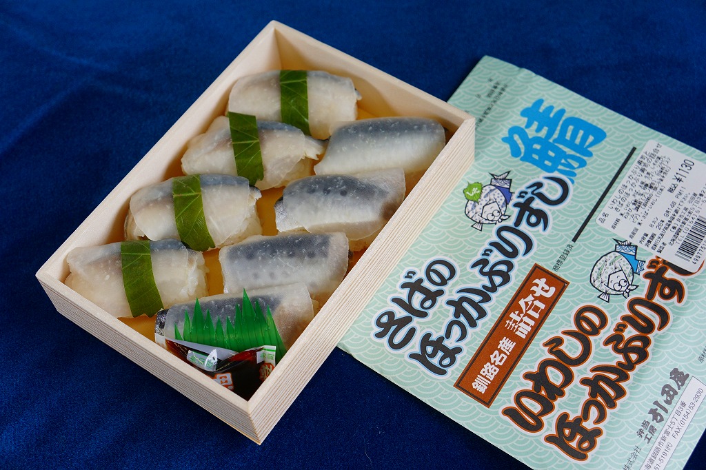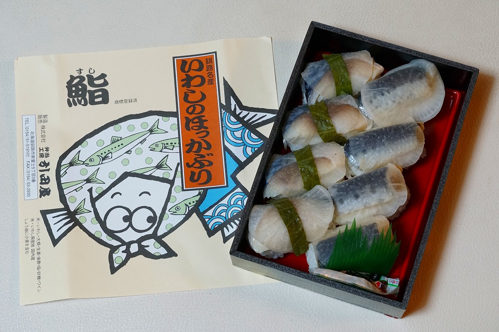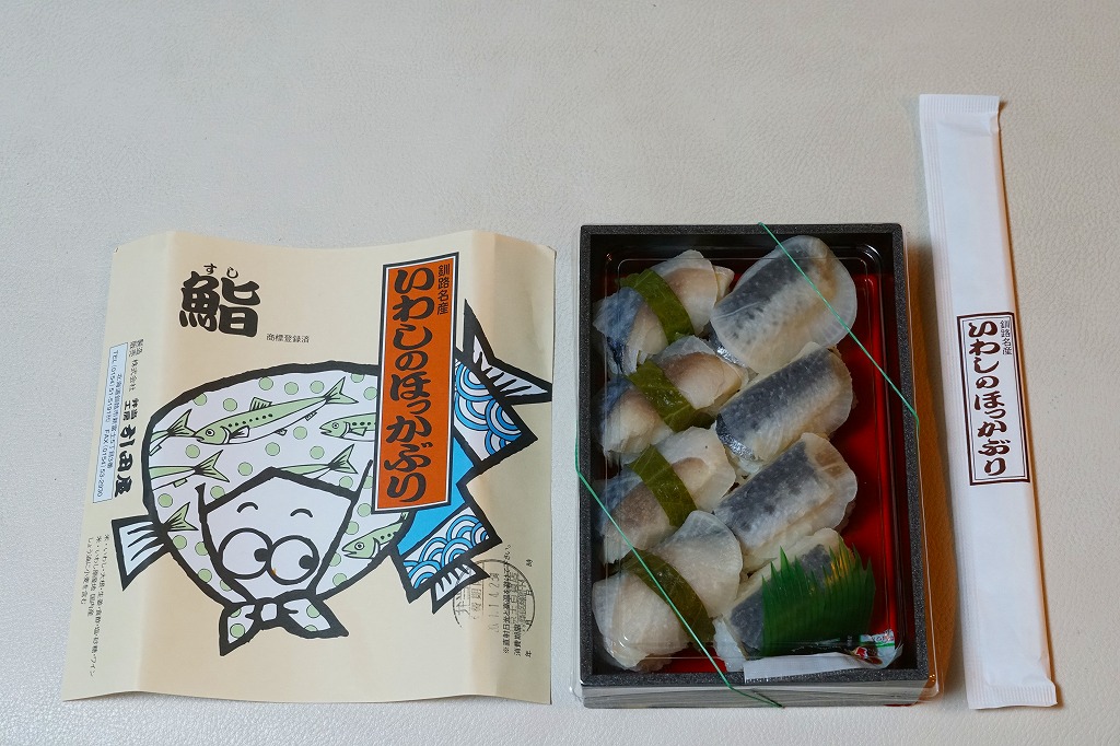 2014(平成26)年1月の京王百貨店の駅弁大会で実演販売、または2013年の秋までに釧路駅で発売か。駅弁の名前は、掛紙ではこのように定かでなく、市販の時刻表などでは「いわしとさばのほっかぶり寿司」と表記される。釧路駅の駅弁「いわしのほっかぶりずし寿司」の、8個のイワシの中身のうち4個をサバに置き換えたもの。魚の違いは分かるけれど、味はたいして違わない。価格は2014年時点で1,100円、2015年時点で1,130円、2020年時点で1,290円、2022年時点で1,350円、2025年時点で1,380円。