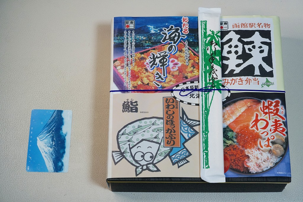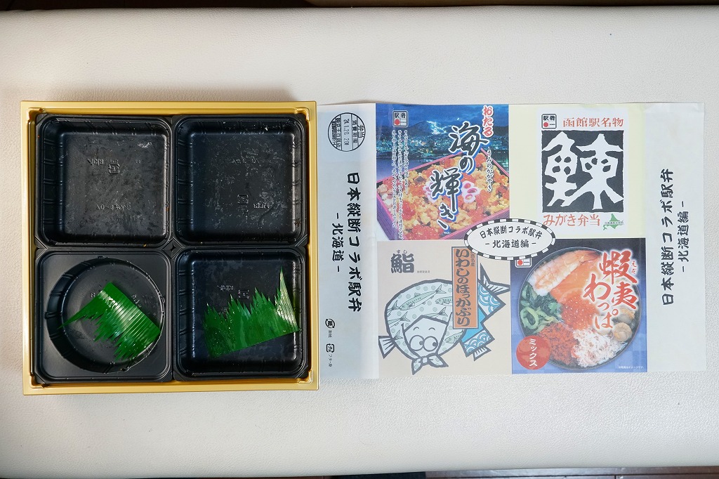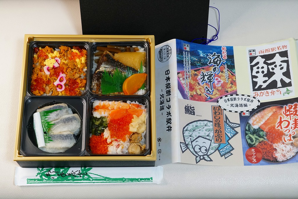 この北海道編は、小樽駅「おたる海の輝き」と、函館駅「鰊みがき弁当」と、旭川駅「蝦夷わっぱミックス」と、釧路駅「いわしのほっかぶり鮨」の詰合せ。大きな掛紙には、その4種類の駅弁の掛紙の一部や縮小版をタイル状に組み合わせた。中身も正方形の4区画で、それぞれの御飯の部分を詰合せ。味も当然に、それらと同じ。各駅弁は黒いプラ製トレーに詰めたが、いわしのほっかぶり鮨に限って丸いくぼみに収め、これに限って駅弁マークが付いていない。