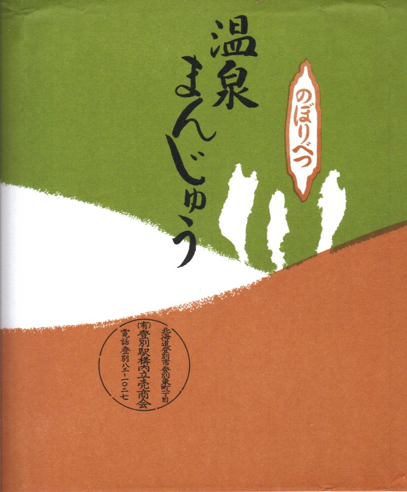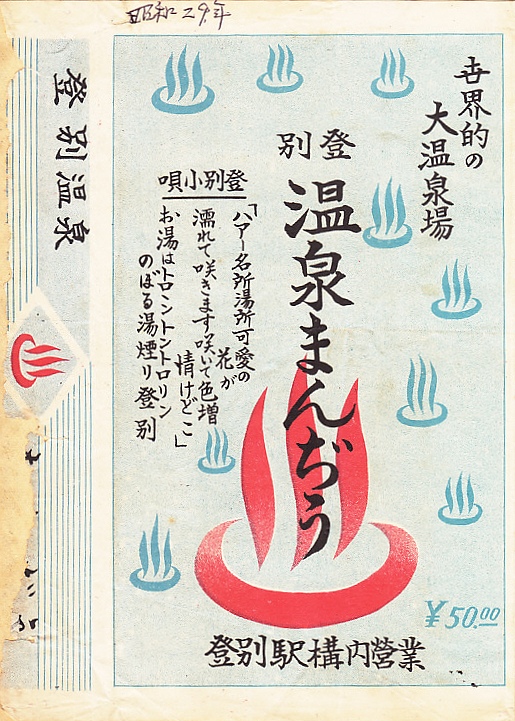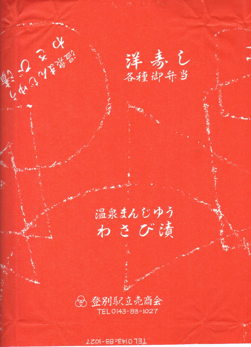 1950年代、昭和30年前後のものと思われる、昔の登別駅の駅売り饅頭の掛紙。収集者は1954(昭和29)年のものとみなし、掛紙に書き入れた。温泉マークを並べて「世界的の大温泉場」と高らかにうたい、登別小唄の1番の歌詞を記す、昭和時代の雰囲気。駅から温泉までは歩けば2時間はかかりそうだが、登別駅は開業時から一貫して登別温泉の玄関口であり、第二次大戦前には鉄道で行けた時代があった。この駅では当時は駅弁でなく、わさび漬、温泉饅頭、ひょうたん飴、わかさ芋のような土産物が構内営業で売られたらしい。