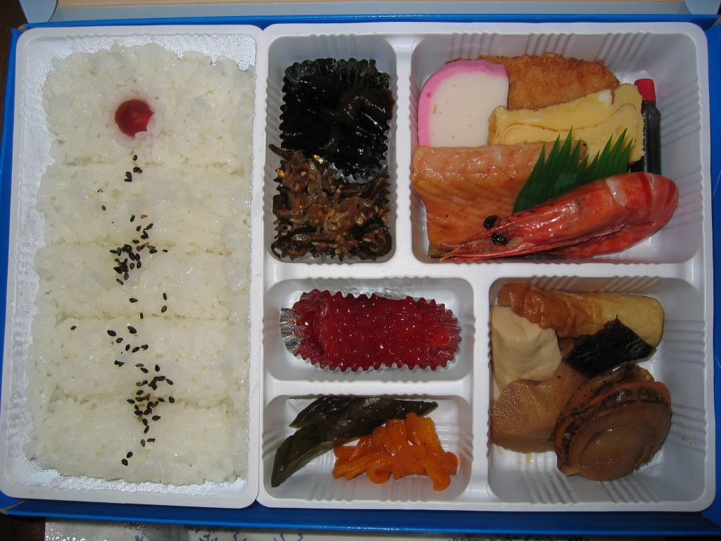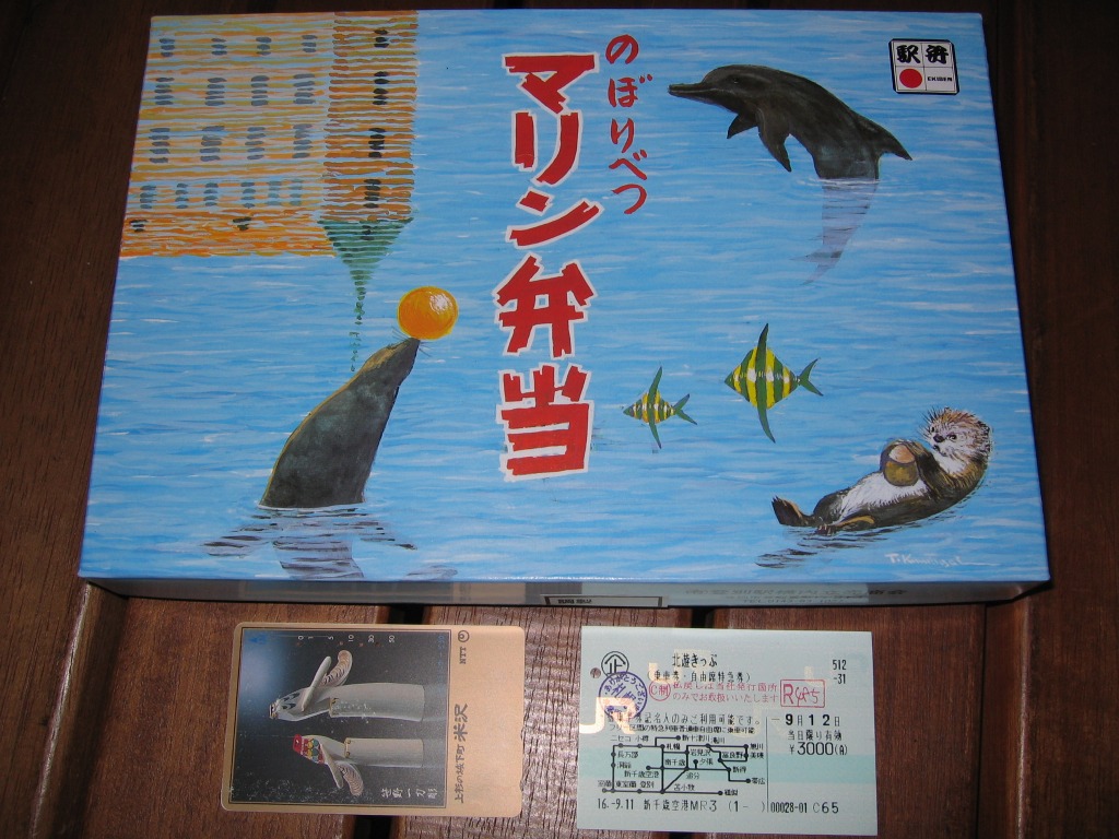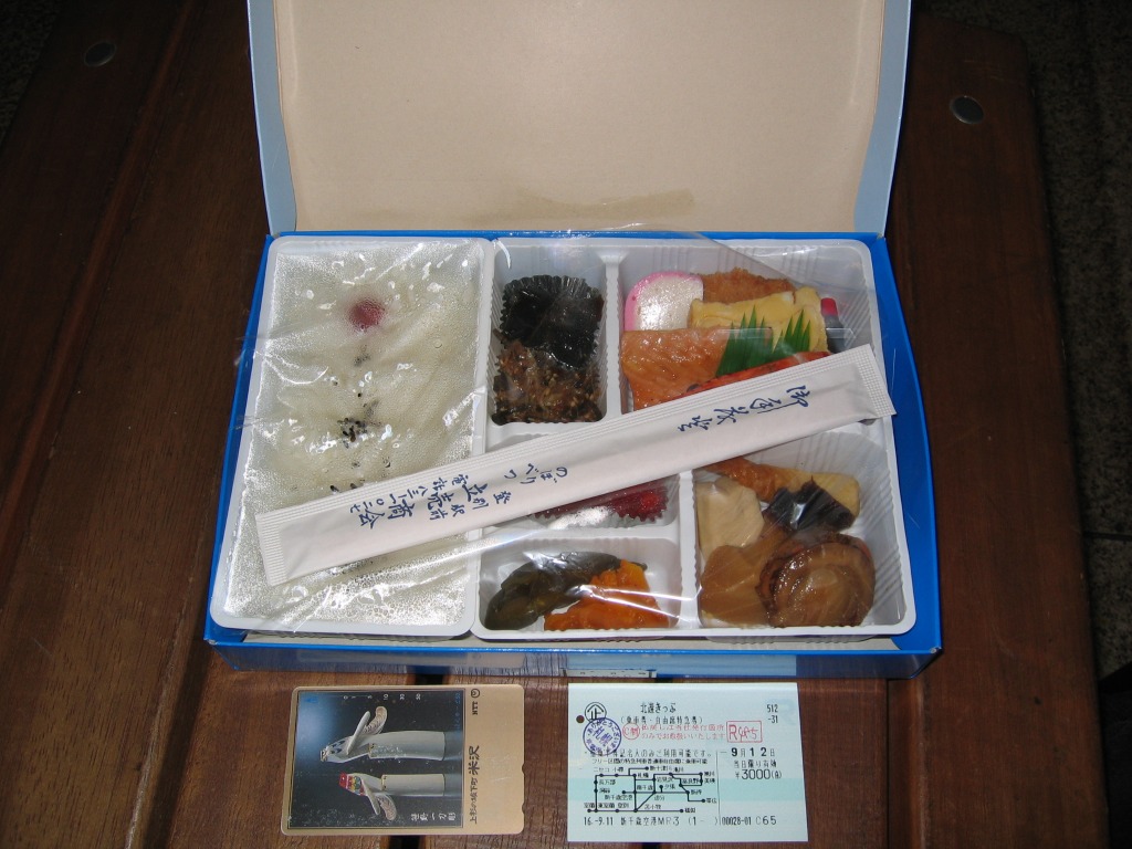 登別駅の近くの観光施設「登別マリンパークニクス」の開業を記念し、1990(平成2)年に発売。専用の青い紙箱には、ラッコとアシカとイルカに「ニクス城」と名付けられた観光施設の建物を描く。中身は暖かい日の丸御飯と、冷たいおかずの有頭海老や焼鮭や玉子焼やコロッケやかまぼこ、ホタテなどの煮物、すじこ、漬物など。北の味もあるような気がする幕の内弁当。調製元の駅弁撤退により、2004年9月限りで失われたらしい。