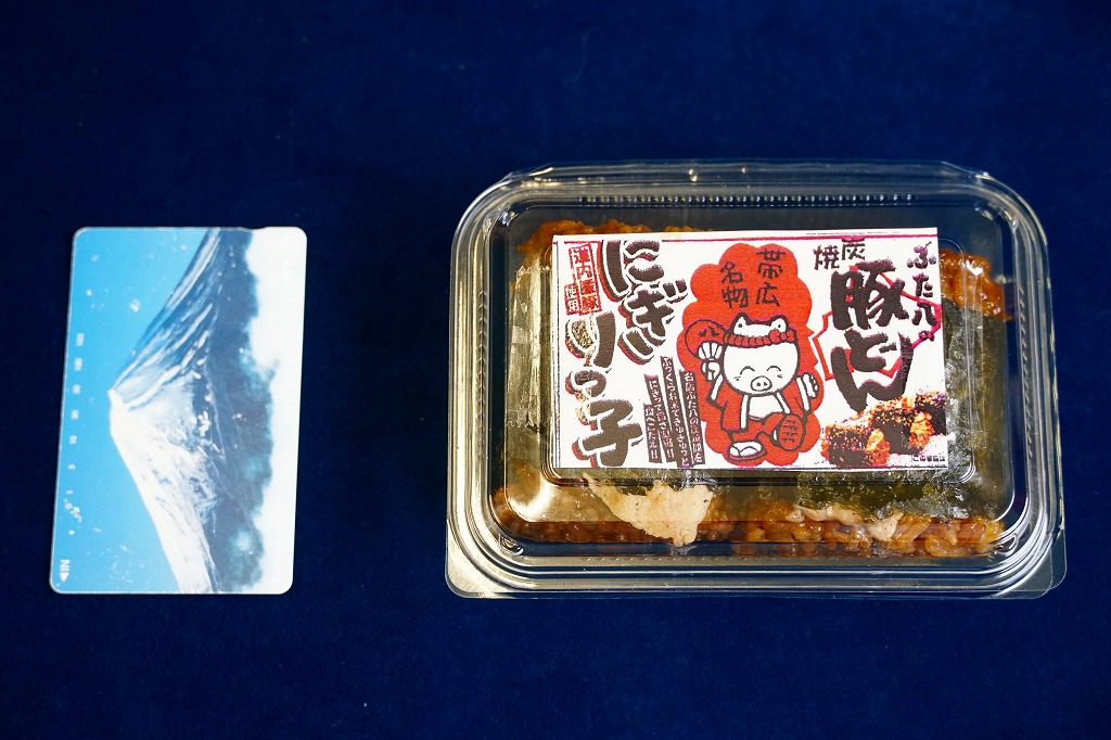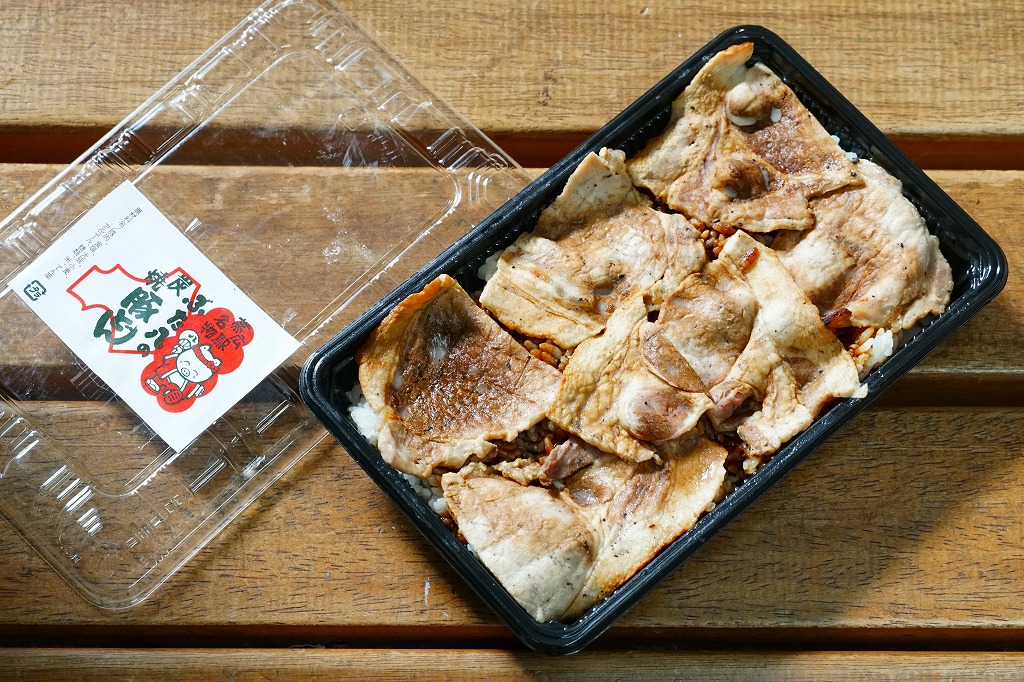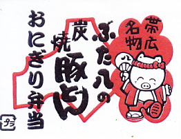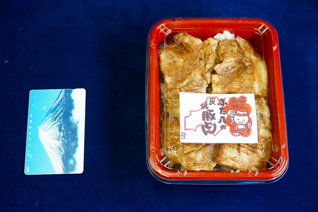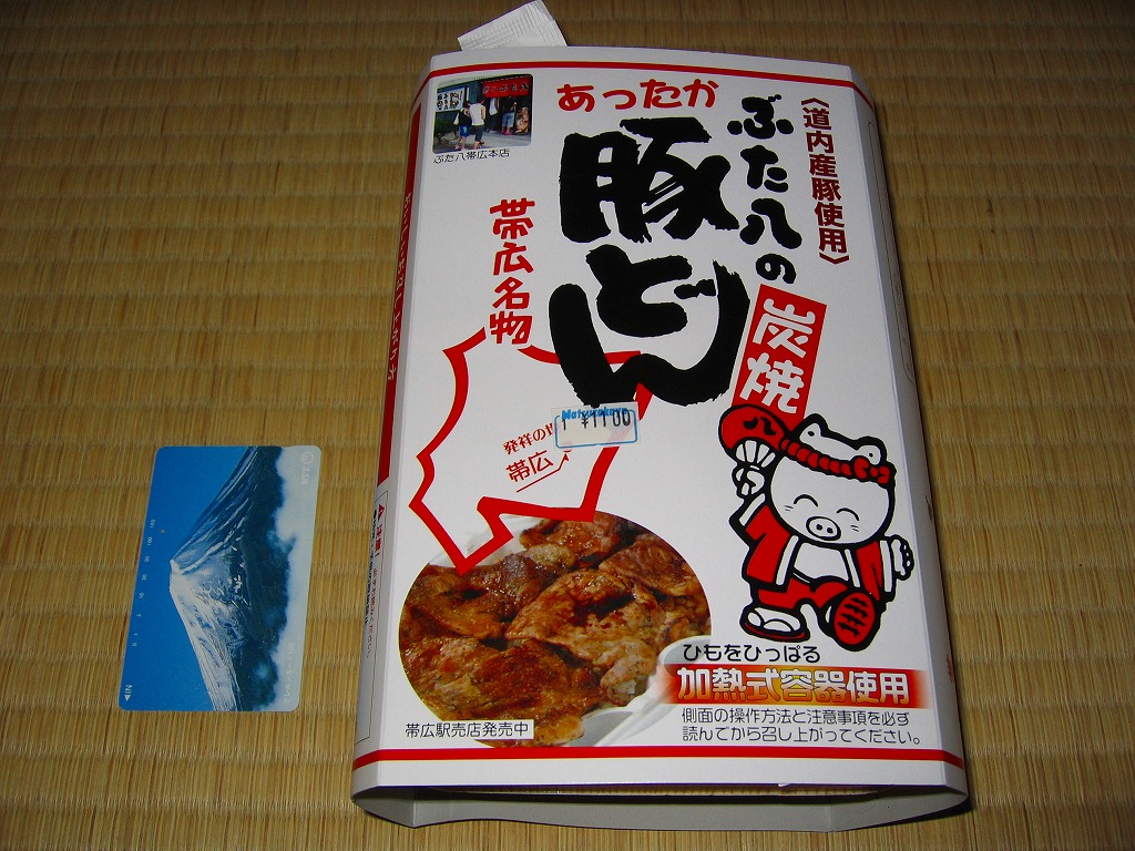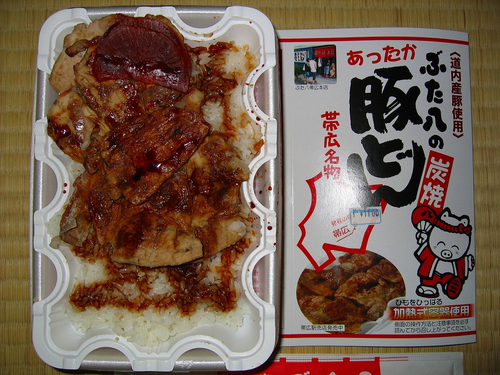 帯広駅の名物駅弁。御飯の上にタレを付けた豚炭火焼肉をたっぷり載せるシンプルなもの。写真は池袋西武百貨店の実演販売で購入したもので、現地版は加熱機能付き容器を使用し、掛紙のデザインが少々異なる模様。2020年時点で帯広駅にこれと同じものはないが、中身が同じものは小、並、大を取り揃える。