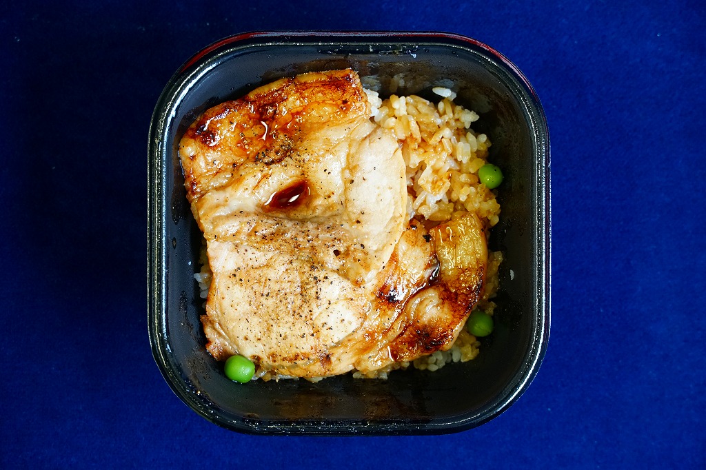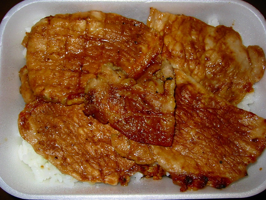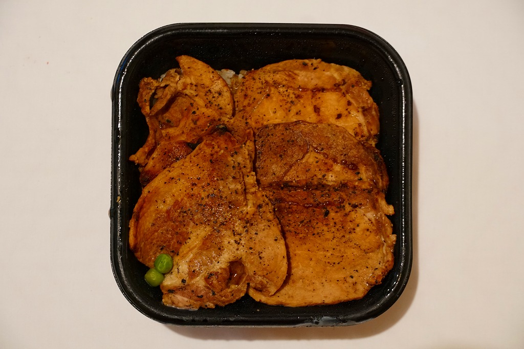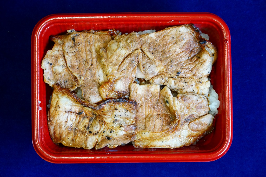 丼もの向けの容器に、白飯を詰めてタレをかけ、豚焼肉を置いてグリーンピースで彩る。注文販売なので、出来立てでホカホカなので、味は柔らか。商品名をしっかり書いた掛紙を巻いていて、今の帯広駅弁より駅弁らしく見えた。これは「2枚」で750円。他に「4枚」1,040円と「6枚」1,430円があり、御飯と肉が増えるらしい。
