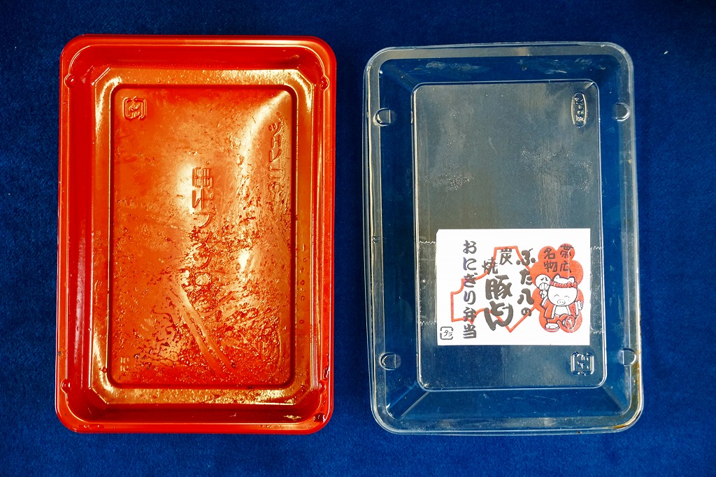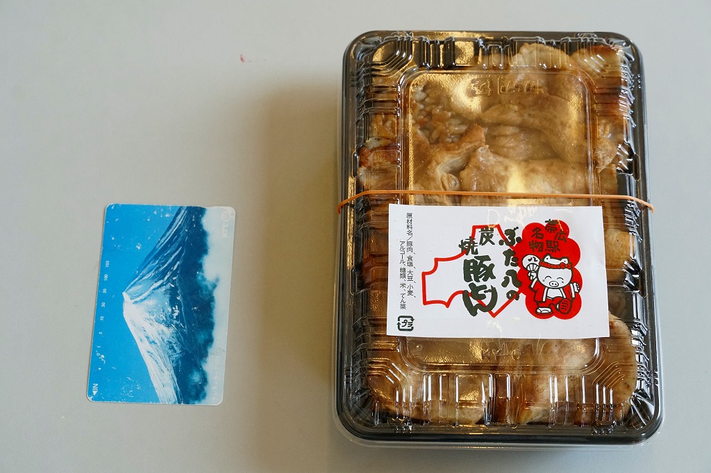 上記の駅弁「ぶた八の炭焼豚どんにぎりっ子」の、2020(令和2)年時点での姿。紙片の絵柄と焼き豚の形状が、上記の2025年のものや、下記の2010年のものと、明らかに異なる。味も豚肉の形の影響で、異なる印象を受けた。