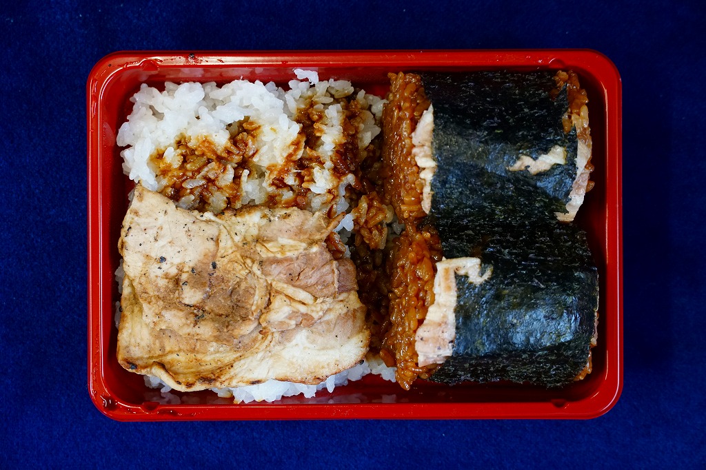 帯広駅の名物駅弁「ぶた八の炭焼豚どん」と、その派生品「にぎりっ子」の詰合せ。惣菜向けのプラ容器は、白飯を敷いてタレをかけて豚肉の炭火焼きで覆って半分、タレ御飯に豚焼肉を合わせて海苔で巻いた太い俵飯2個が半分。価格は2020年の購入時で1,000円、2022年時点で1,100円。