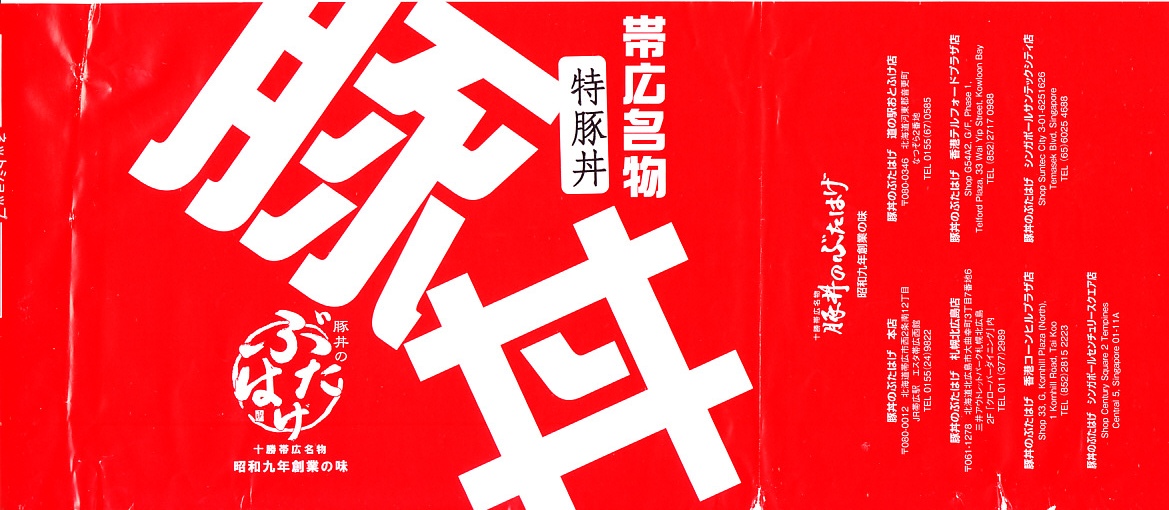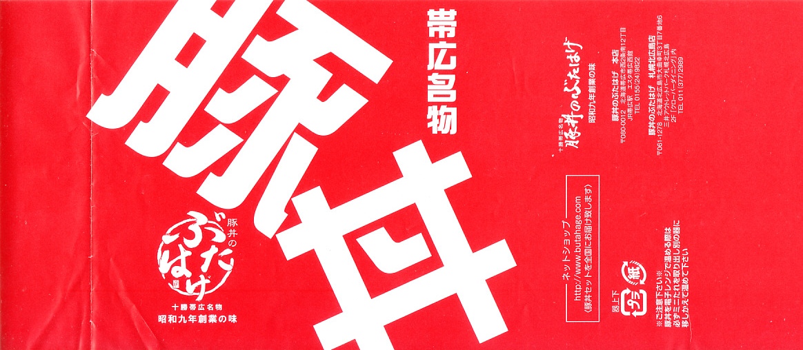 2006(平成18)年1月7日に購入した、帯広駅弁のスリーブ。上記の2023年のものと同じ。首都圏の百貨店での駅弁催事で購入。この時は「炭焼」の文字があり、掛紙でなくスリーブを使い、その印刷はまとも。しかし販売者の社名や電話番号が、帯広の現地と異なるうえに、電話帳などで調べても出てこなかった。平日9時5時のみ営業な食堂や駅弁屋などあり得ないので、催事用のペーパー会社か代行業か。