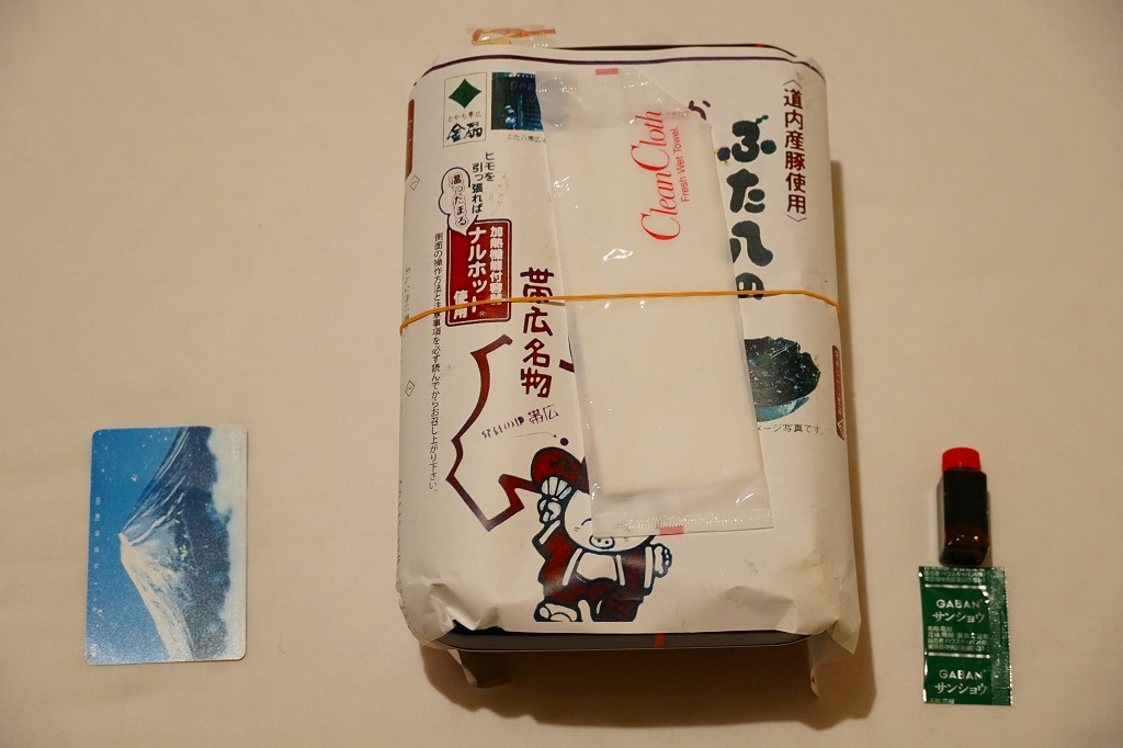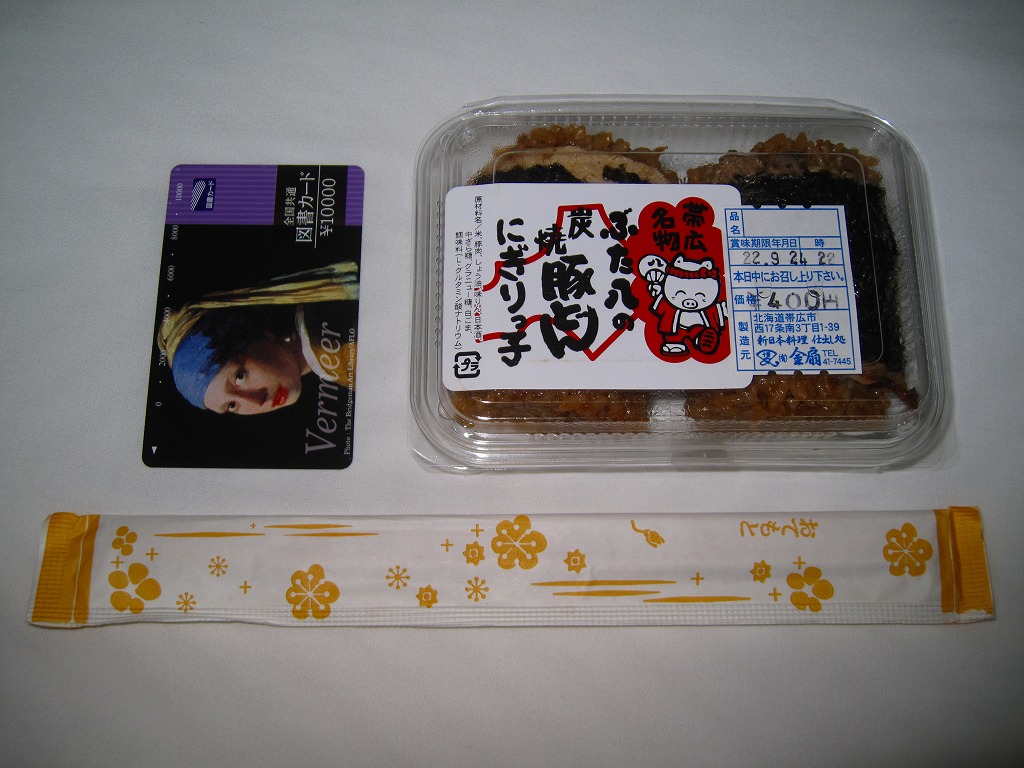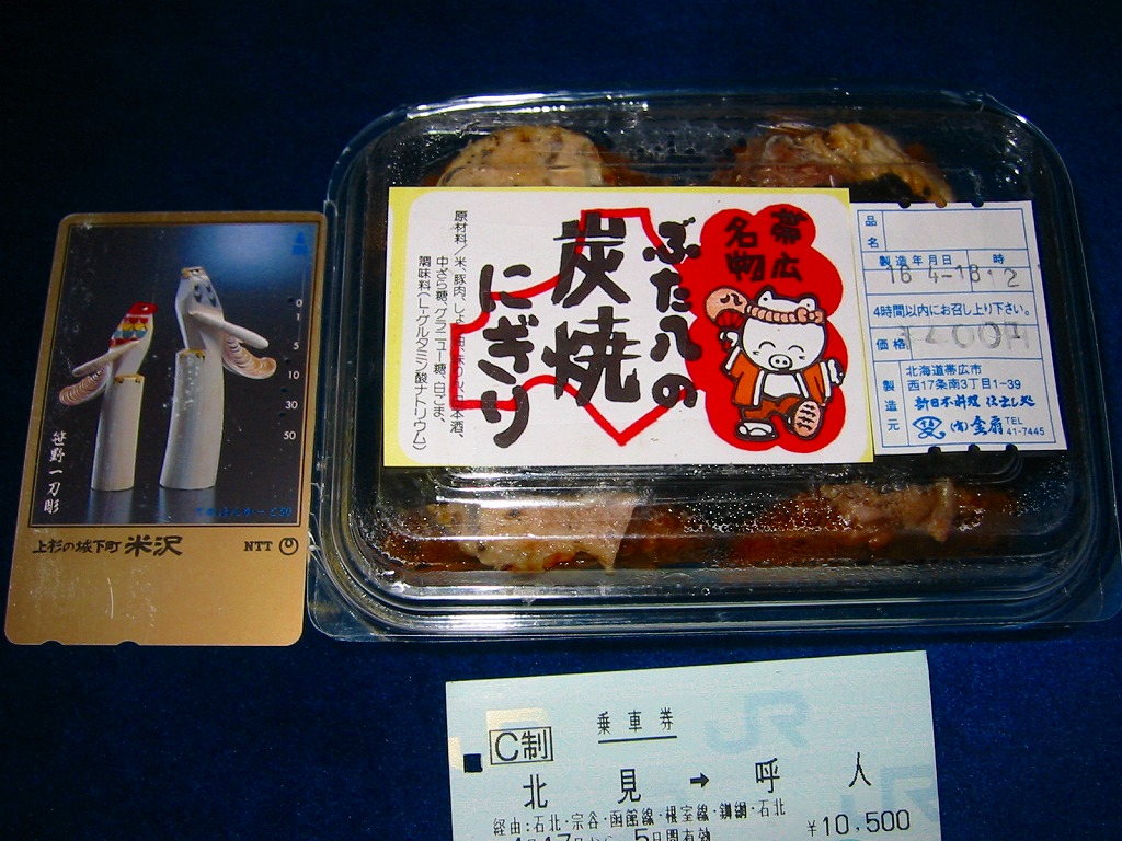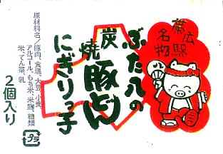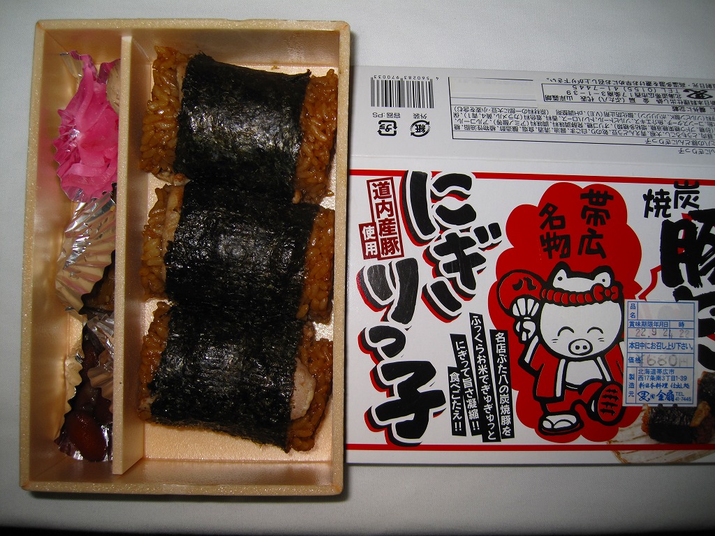 帯広駅の名物駅弁「ぶた八の豚どん」が、3個の握り飯になったもの。小柄な容器を、中身のイメージ写真や商品名や豚のイラストなどを描いたボール紙の枠にはめる。中身はタレに染まる御飯に豚焼肉を合わせて海苔で巻いた俵飯が3個と、煮豆、レンコン煮、大根桜漬。つまり「ぶた八の豚どん」を大きな俵飯にしたもの。やはりなかなか、濃厚な味。2020年時点で現存しない模様。