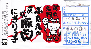 上記の「ぶた八の炭焼豚どんにぎりっ子」の、2010(平成22)年時点での姿。当時は帯広駅のコンビニキヨスクで売られ、商品名と調製元のシールが貼られていた。また、キヨスクの隣に調製元の食堂があったと思う。