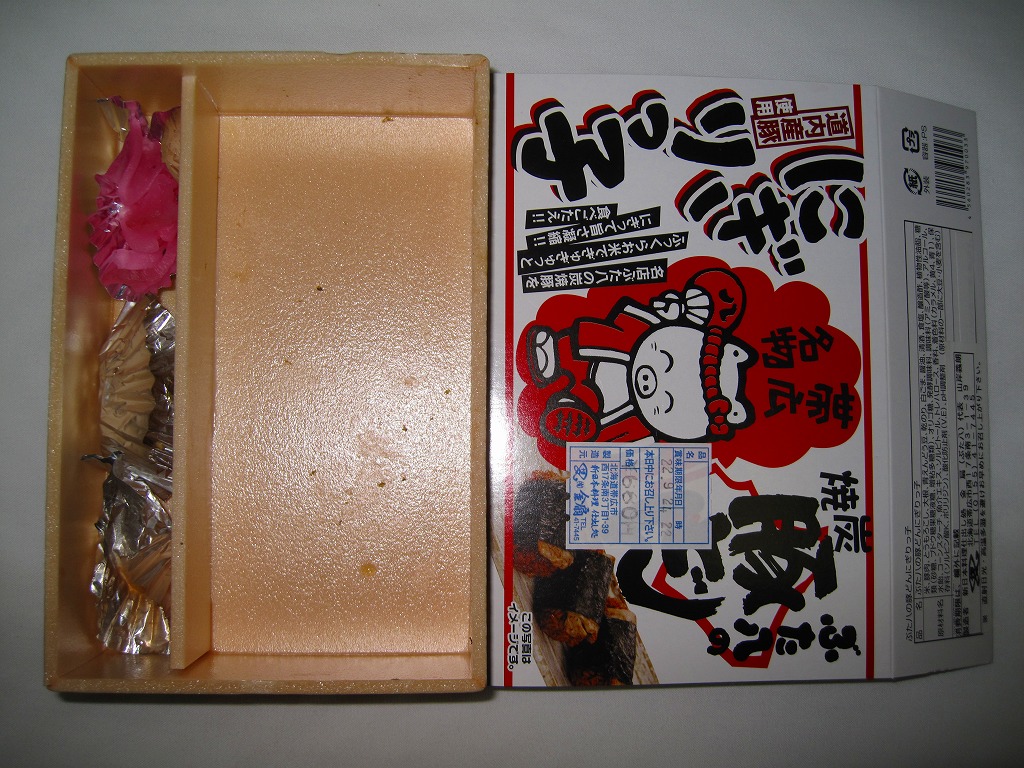 上記の駅弁「ぶた八の炭焼豚どん」の「大」サイズ。値段と大きさを除き、「小」のものと変わらない。紙片の絵柄も、調製元の表記がないことも、まったく同じ。
