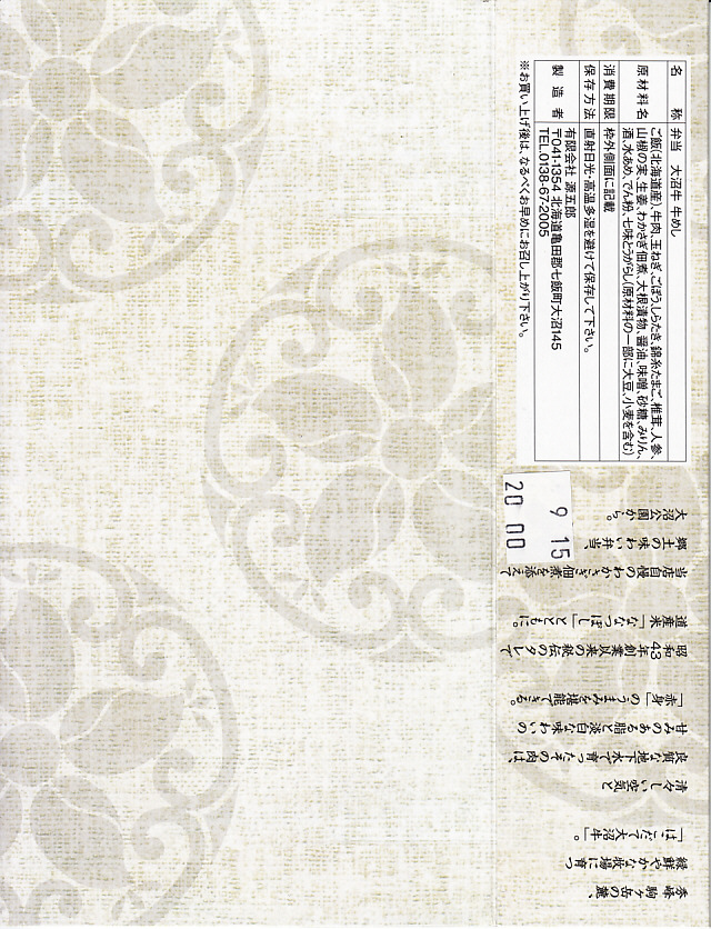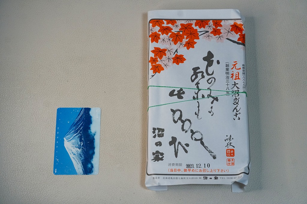 2007(平成19)年6月17日に購入した、大沼公園の駅売り銘菓の掛紙。絵柄は長らく変わらないが、法的な表示や注意書きに小変化が見られる。これは「小」のこしあん。価格は2007年当時で「小」が315円、「大」が525円。これを特急列車の車内販売で予約購入すると、「小」が350円となった。
