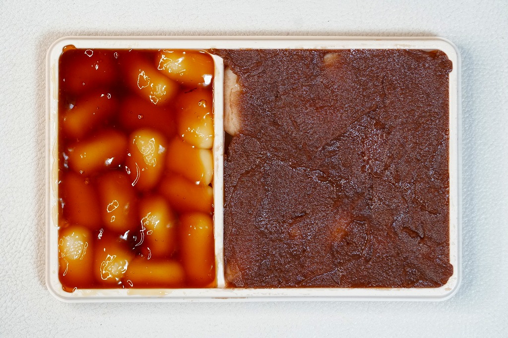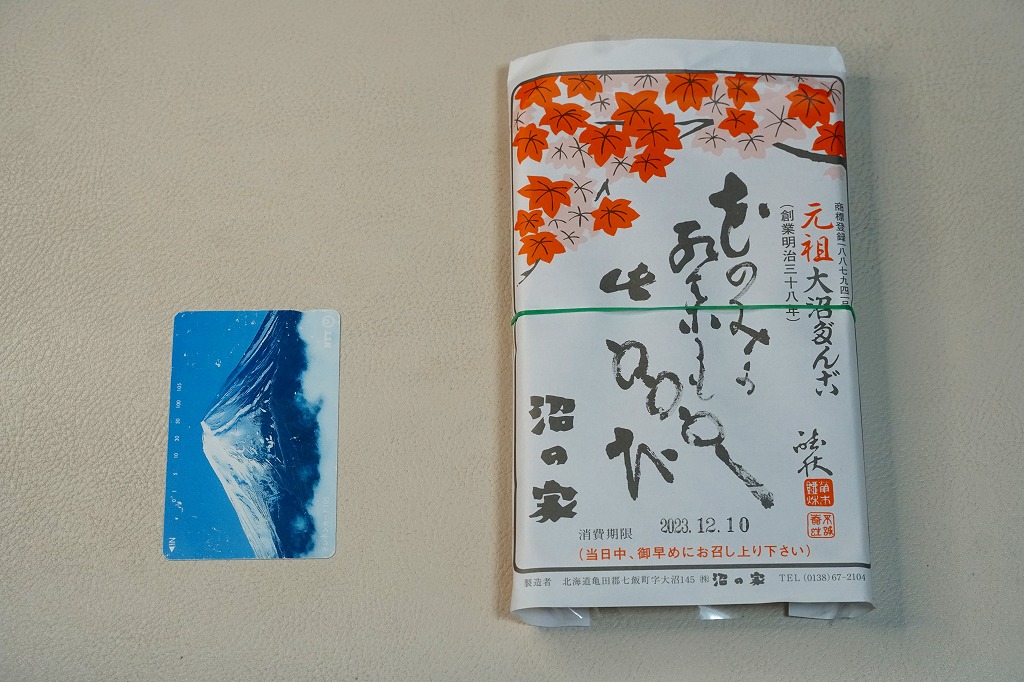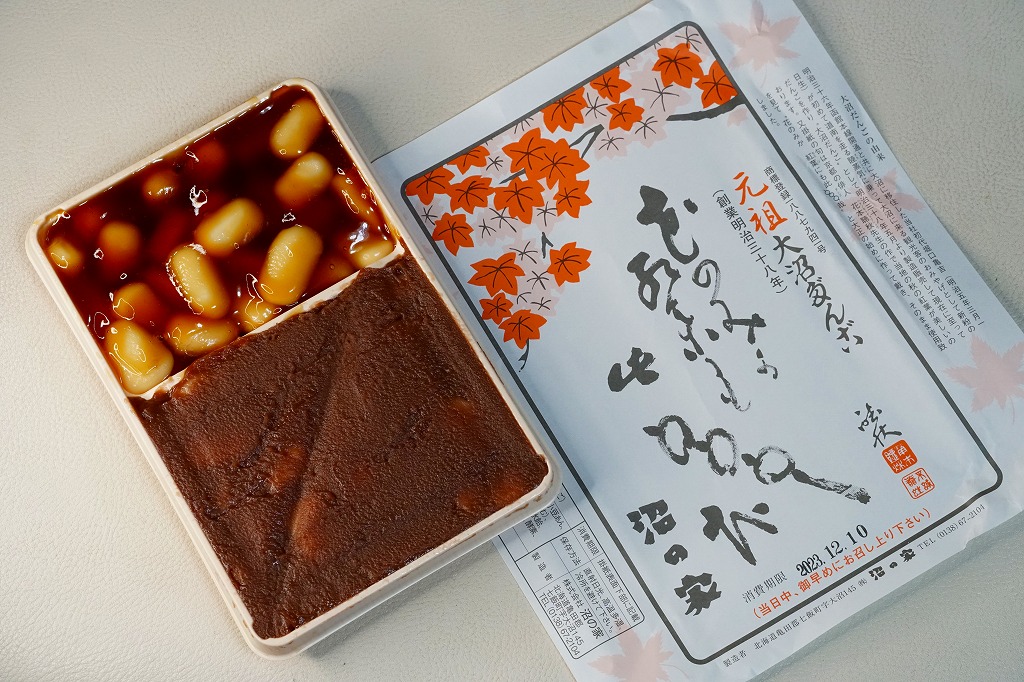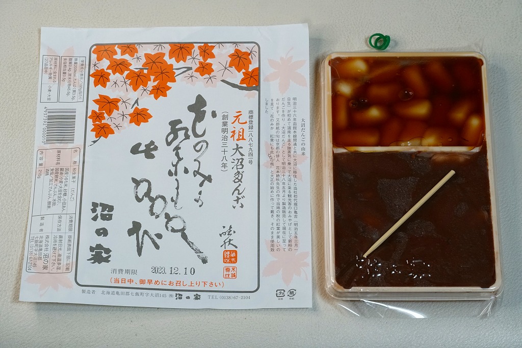 1905(明治38)年5月に発売したという鉄道銘菓で、大沼公園駅で長い間立ち売りが実施されたもの。軽食駅弁の大きさで、しかし厚さが約2センチしかない薄いプラ容器に、文字がとても読めない掛紙をかけて、輪ゴムでしばる。中身は小指の先ほどの団子の上に、容器の2/5は醤油だれを、3/5はこしあんまたは黒ごまをかけたもの。「大」と「小」、こしあんと黒ごまで、4種類が売られる。これは「小」のこしあん。