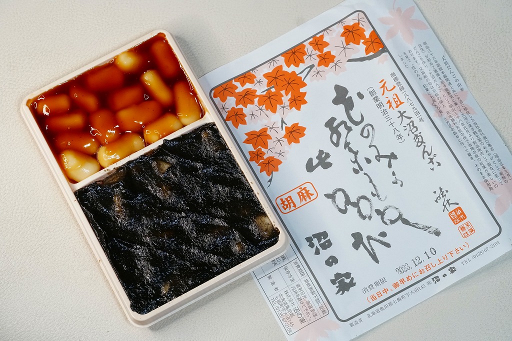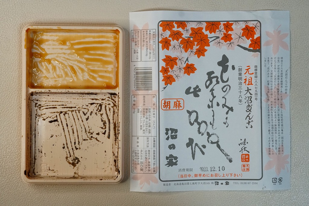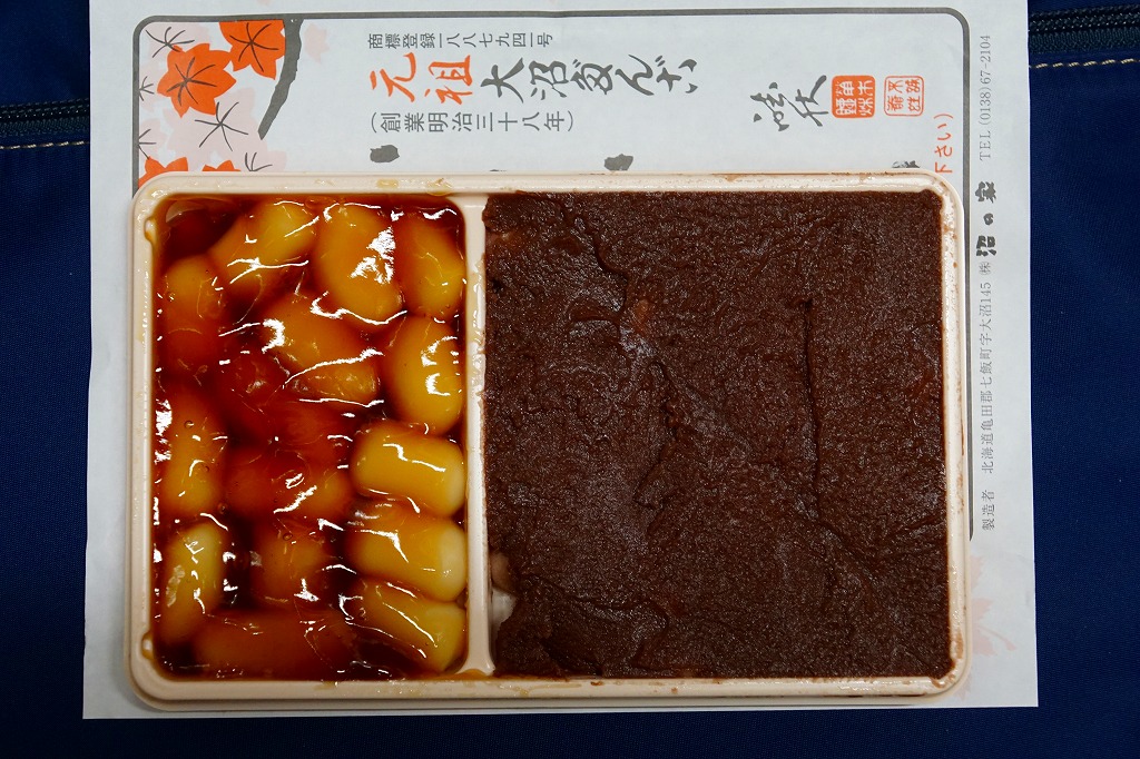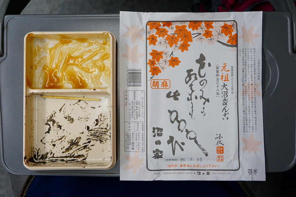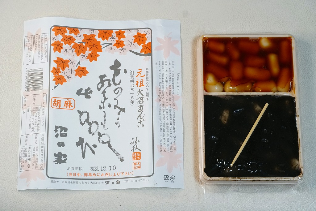 1905(明治38)年5月に発売したという鉄道銘菓で、大沼公園駅で長い間立ち売りが実施されたもの。軽食駅弁の大きさで、しかし厚さが約2センチしかない薄いプラ容器に、文字がとても読めない掛紙をかけて、輪ゴムでしばる。中身は小指の先ほどの団子の上に、容器の2/5は醤油だれを、3/5はこしあんまたは黒ごまをかけたもの。「大」と「小」、こしあんと黒ごまで、4種類が売られる。これは「大」の黒ごま。胡麻の味は個人的に格別。