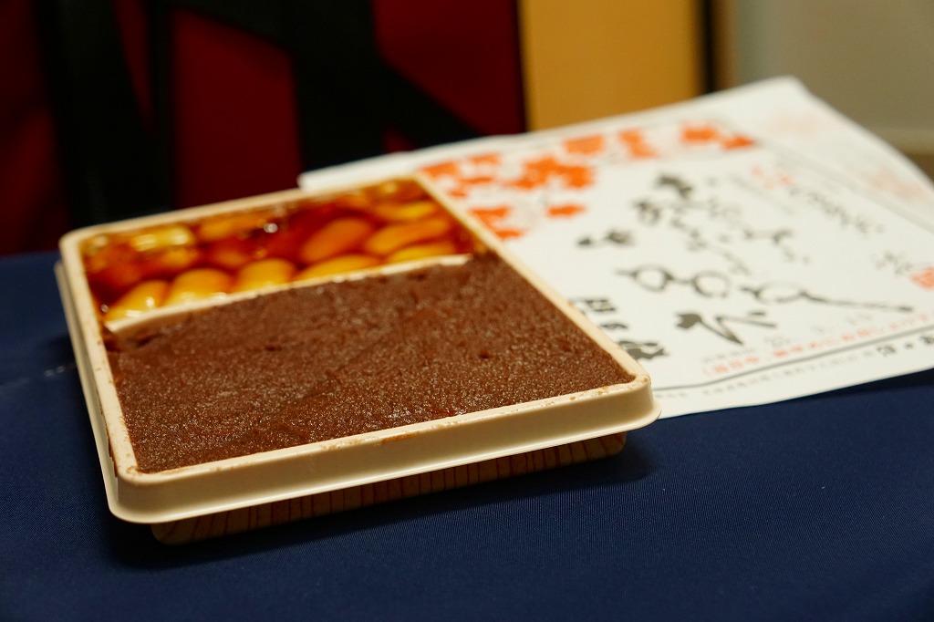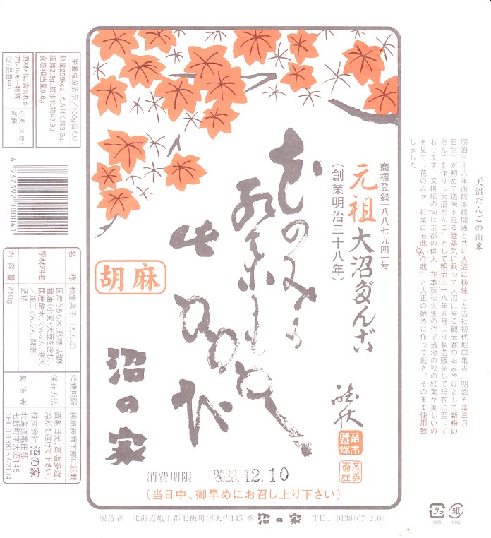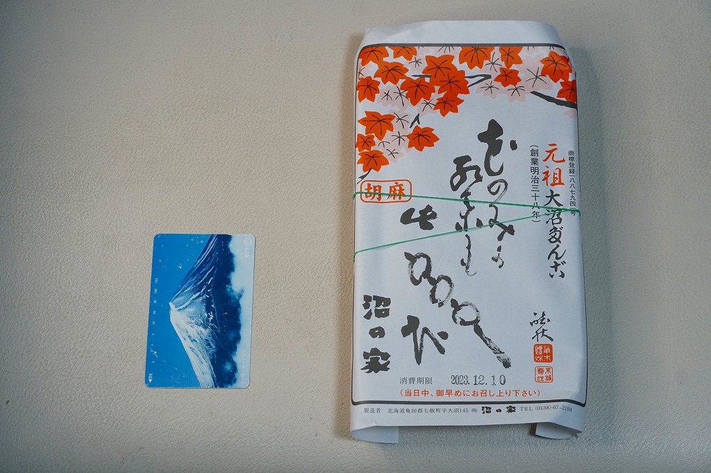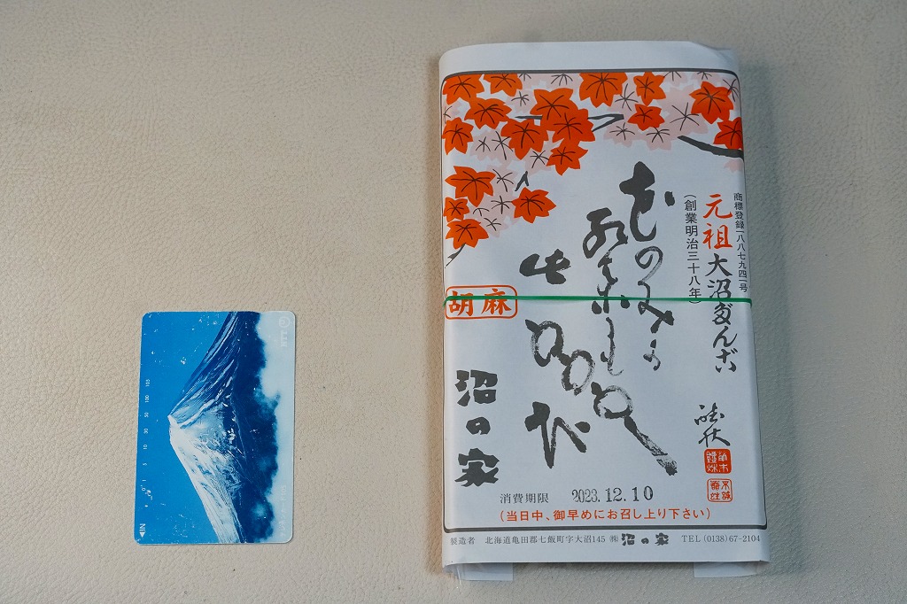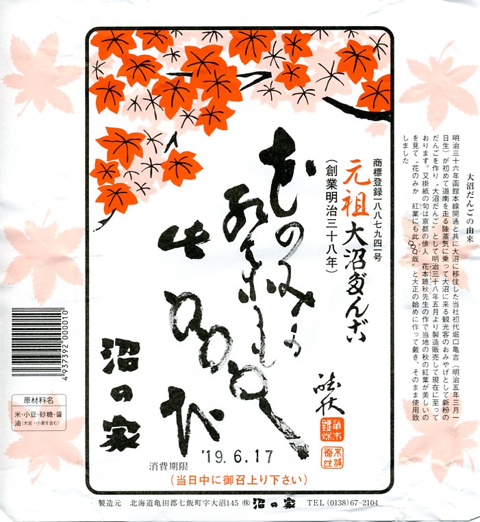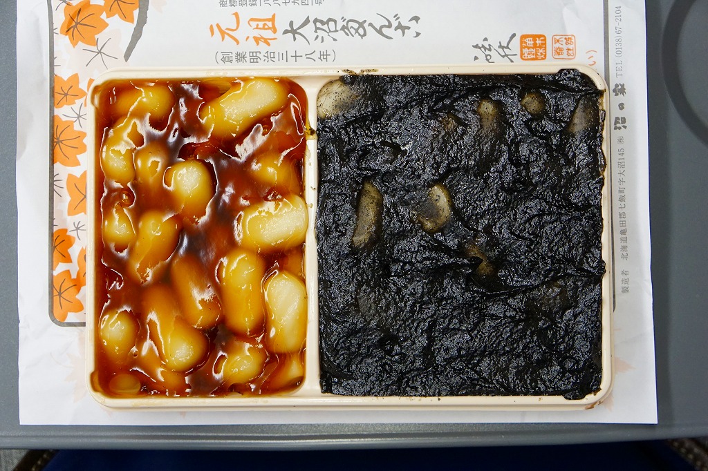 1905(明治38)年5月に発売したという鉄道銘菓で、大沼公園駅で長い間立ち売りが実施されたもの。軽食駅弁の大きさで、しかし厚さが約2センチしかない薄いプラ容器に、文字がとても読めない掛紙をかけて、輪ゴムでしばる。中身は小指の先ほどの団子の上に、容器の2/5は醤油だれを、3/5はこしあんまたは黒ごまをかけたもの。「大」と「小」、こしあんと黒ごまで、4種類が売られる。これは「大」の黒ごま。胡麻の味は個人的に格別。
