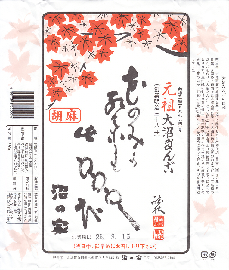 2014(平成26)年9月15日に購入した、大沼だんごの掛紙。これは「大」の黒ごま。昔も今も、そしてきっとこれからも、変わらない絵柄と中身だと思う。