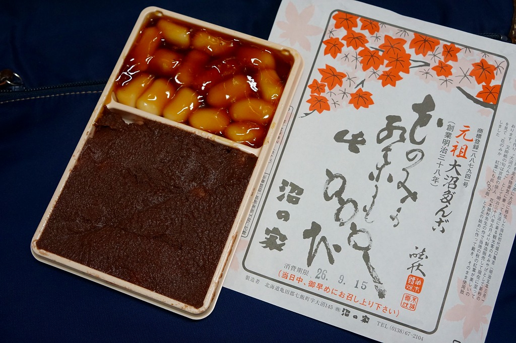 1905(明治38)年5月に発売したという鉄道銘菓で、大沼公園駅で長い間立ち売りが実施されたもの。軽食駅弁の大きさで、しかし厚さが約2センチしかない薄いプラ容器に、文字がとても読めない掛紙をかけて、輪ゴムでしばる。中身は小指の先ほどの団子の上に、容器の2/5は醤油だれを、3/5はこしあんまたは黒ごまをかけたもの。「大」と「小」、こしあんと黒ごまで、4種類が売られる。これは「大」のこしあん。