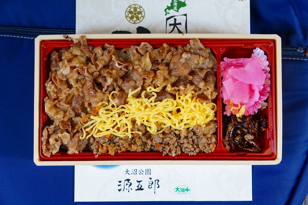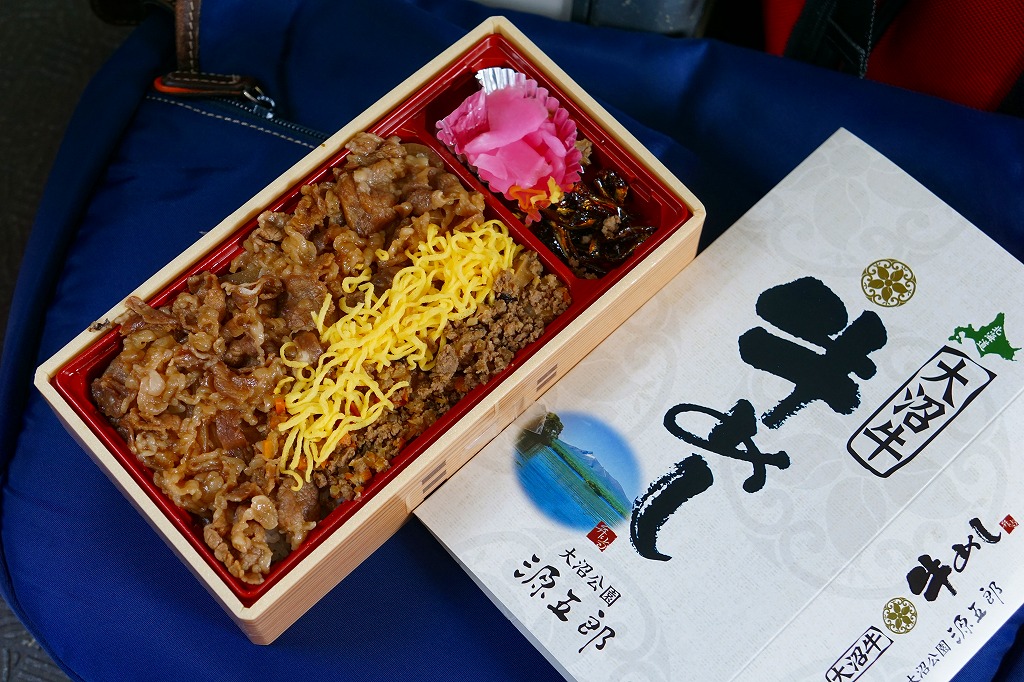 2010(平成22)年5月1日に大沼公園駅で発売。駅前の和食堂でつくる牛肉駅弁。土休日の昼間に限り、作り置きの駅での販売でなく、主に注文や予約で売られる模様。見た目は全国各地の牛肉駅弁と同じく、長方形の容器に白飯を詰め、大沼牛の牛すき焼きと牛そぼろと錦糸卵で覆い、ワカサギ佃煮と大根漬物を添える。