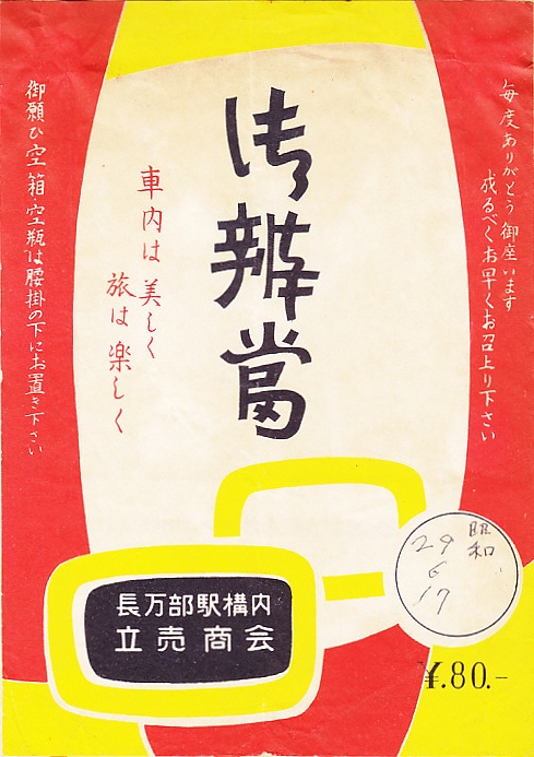 1950年代、昭和30年前後のものと思われる、昔の長万部駅弁の掛紙。収集者は1954(昭和29)年6月17日の調製とみなし、掛紙の調製印欄に書き入れた。「かにめし」以外の長万部駅の駅弁掛紙が残るのは少し珍しいと思い、長万部駅の駅弁掛紙は異様に多く残されていると思う。