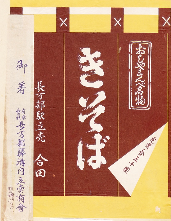 第二次大戦後のものと思われる、昔の長万部駅弁の掛紙。収集者は箸袋とともにスクラップブックに貼り付け、1954(昭和29)年8月7日の調製と判断し、箸袋に書き入れた。長万部駅の駅弁では、「かにめし」の掛紙があんなにたくさん残されているのに、そばの掛紙はほとんどみられないと思う。