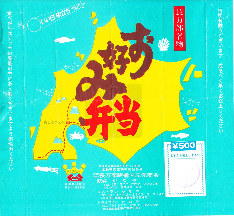1981(昭和56)年6月4日9時の調製と思われる、昔の長万部駅弁の掛紙。「かにめし」の掛紙は多く出回るが、幕の内弁当の掛紙はほぼ見たことがない。北海道と海産物と路線図が、とてもアバウトに描かれる。江差線の一部と松前線が描かれて、列車が長万部駅に発着したはずの瀬棚線が描かれないことが不思議。