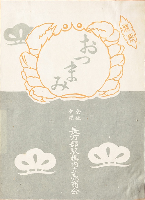 長万部駅の駅弁屋の商品の掛紙。この絵柄だけでは、時期も内容も特定できない。商品名はカニの甲羅に記され、松と思われる絵柄に囲まれる。