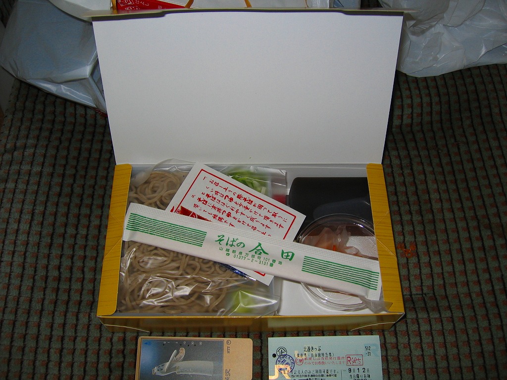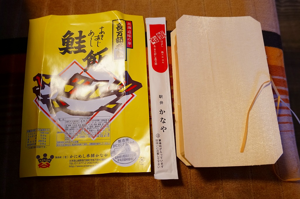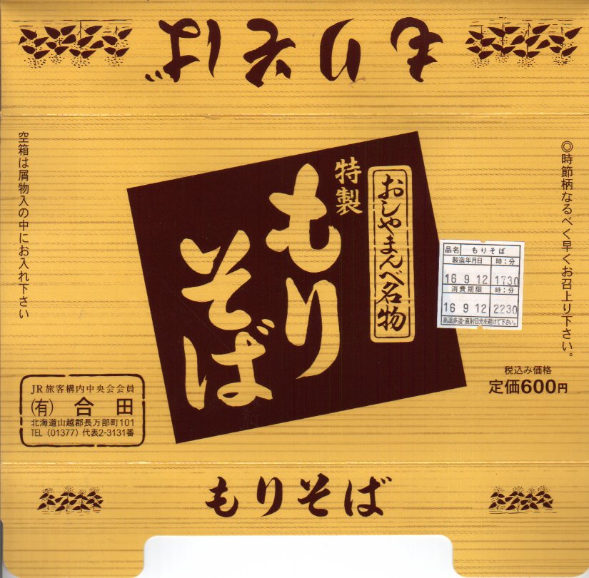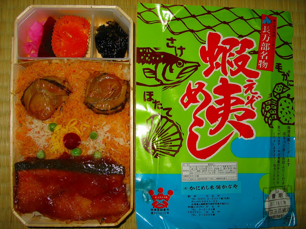 2004(平成16)年9月12日に購入した、長万部駅弁の箱。上記の16年後とおおむね同じで、中身も変わらない。当時は調製元のところに「JR旅客構内中央会会員」の表記があった。