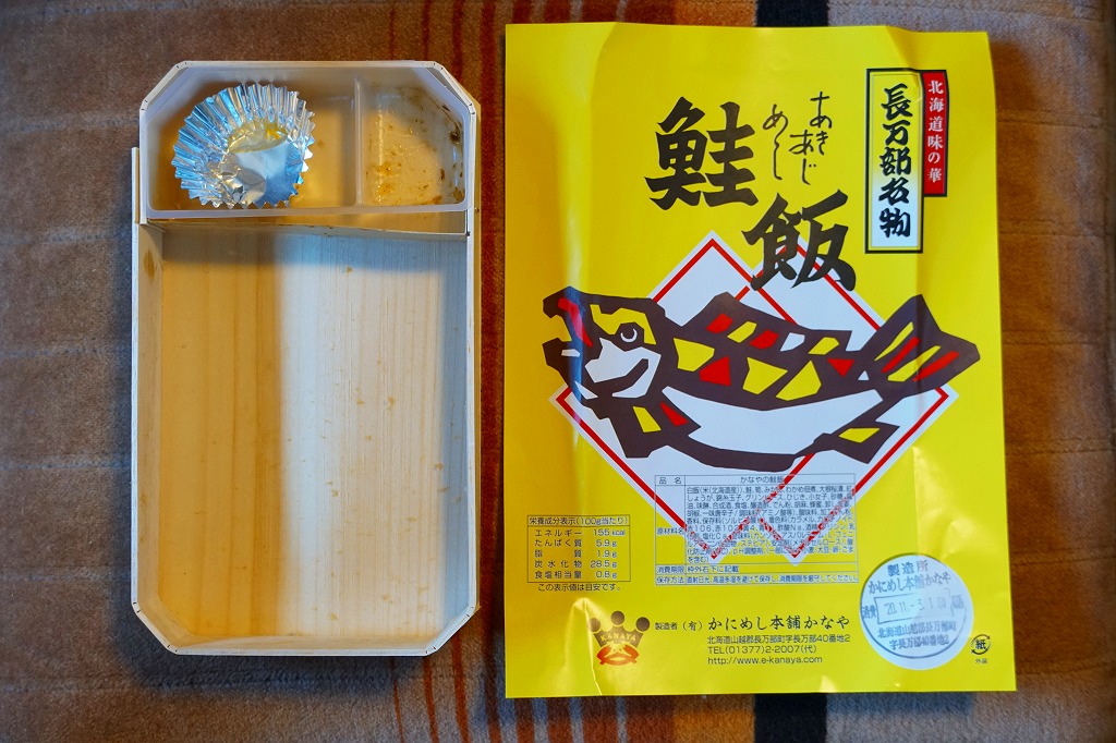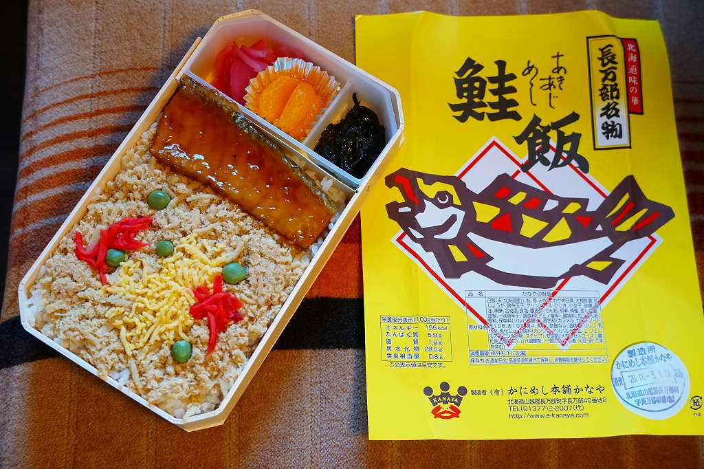 フレークはぼそぼそ、この弁当の特徴である鮭の煮付けは、下記の「蝦夷めし」より分量もワイルドさも半分という軽い印象で、食べやすい感じだった。価格は2018年時点で1,080円。