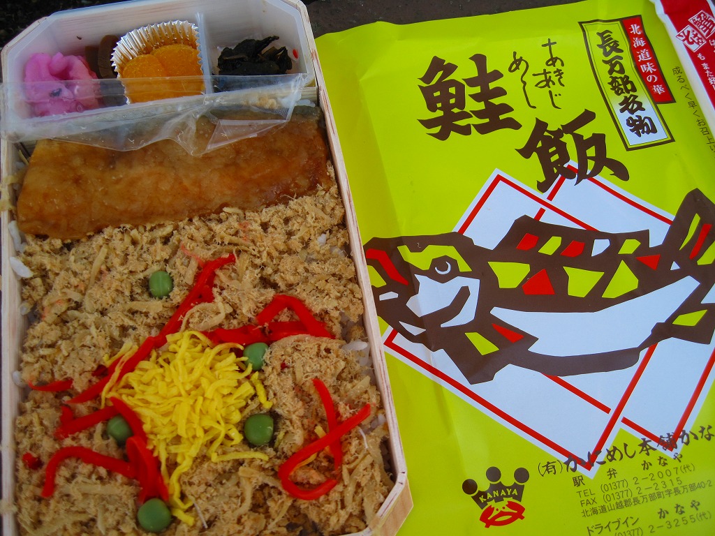 国鉄時代の資料にその名がないため、昭和60年代の発売か。それにしては古めかしい姿をしていると思う、通好みのマイナーな駅弁。有名な駅弁「かにめし」と同じ経木折に、駅弁の名前と食材「さけ」「ほたて」「毛がに」など描いた掛紙をかける。中身は中身は御飯の上にカニほぐし身とホタテ2個、そして衣というかタレをまとう鮭の切り身ひとつ。どこの駅弁や惣菜にも似ない、鮭のなんともいえない味付けに、遠くに来たなと感じさせる強烈な個性が出ている。