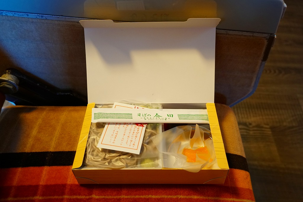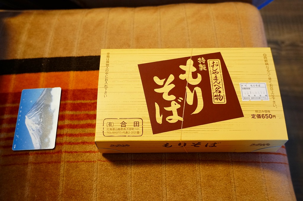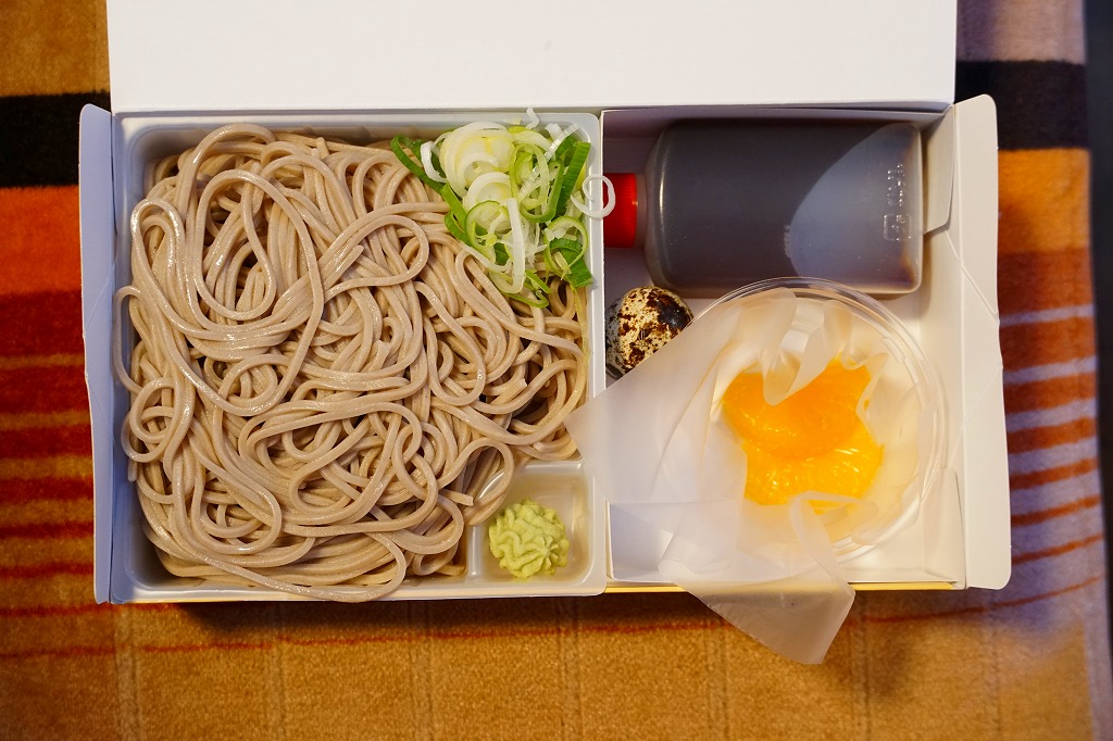 1931(昭和6)年に長万部駅で発売。全国初で、長らく全国で唯一だった、そばの駅弁。専用の厚紙箱に、もりそばと青ネギと練りワサビ、うずらの生卵とミカンとボトルのめんつゆを収める。内容も風味も、名前のとおりのもりそば。