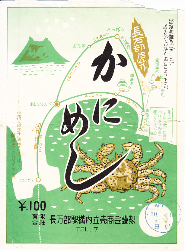 1960年代前半、昭和30年代後半、10月4日16時の調製と思われる、昔の長万部駅弁の掛紙。長万部駅の名物駅弁「かにめし」の掛紙が青くなる前の姿を残す。