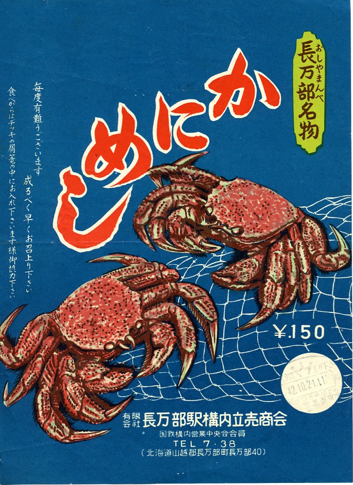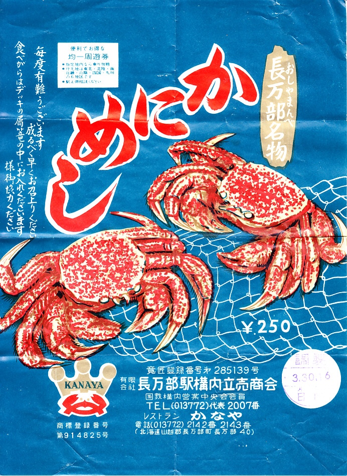 1963(昭和38)年11月18日16時の調製と思われる、昔の長万部駅弁の掛紙。下記の掛紙「かにめし」と、記載内容はほぼ同じだが、絵柄は作り替えられている。長万部駅の名物駅弁「かにめし」の掛紙が青くなる前の姿を残す。