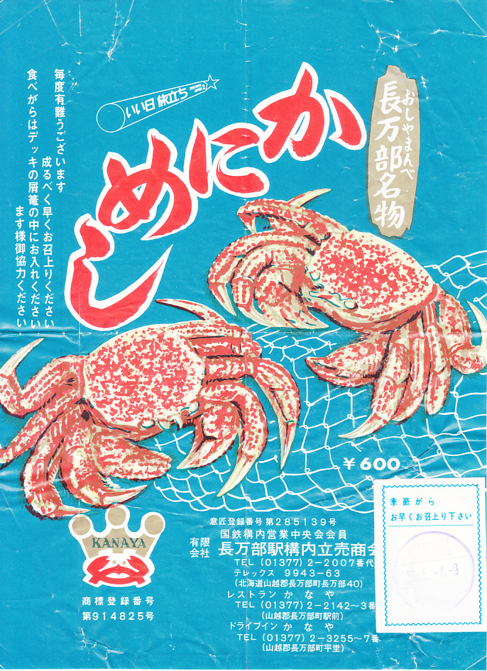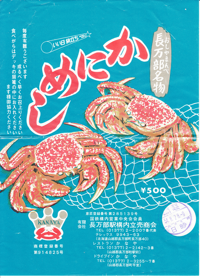 2001(平成13)年9月10日15時の調製と思われる、昔の長万部駅弁の掛紙。下記の1994年のものと比べて、価格がシールから印字に変わり、調製印が調製日時と消費期限の年月日時二段書きに変わり、意匠登録や商標登録の記述、食中毒防止の注意書き、テレックスの番号、和風レストランの表示が消えている。