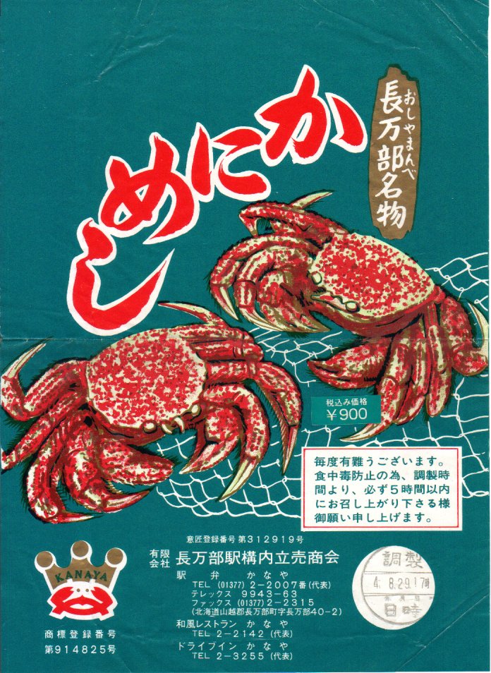 1992(平成4)年8月29日17時の調製と思われる、昔の長万部駅弁の掛紙。1987年の国鉄分割民営化を受けて、国鉄の駅構内営業者の団体である国鉄構内営業中央会は、その名を日本鉄道構内営業中央会に改めたため、全国各地の駅弁掛紙で名称を差し替えたが、ここでは名称を削除してしまった。