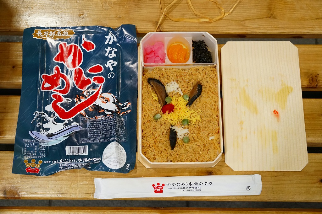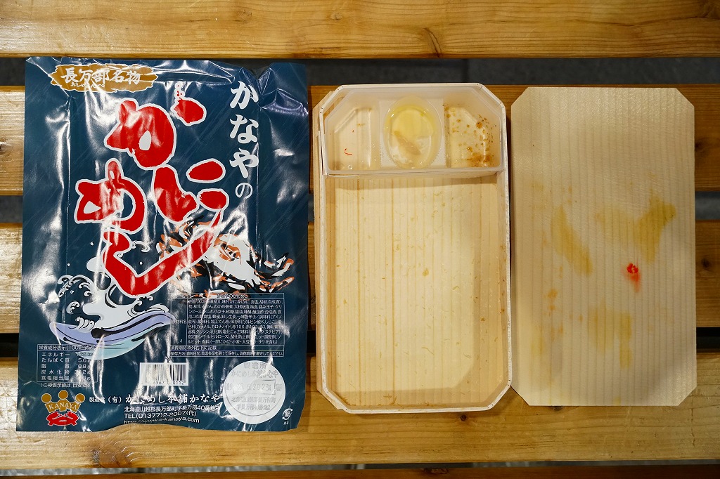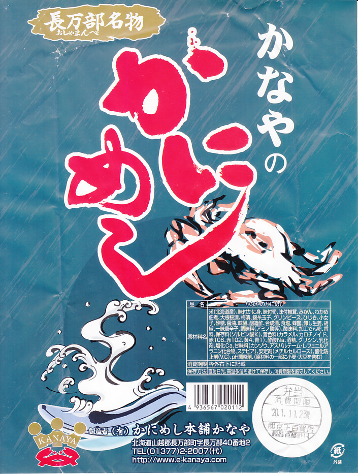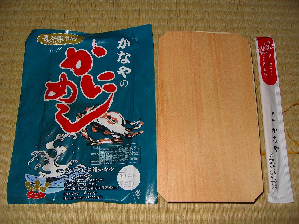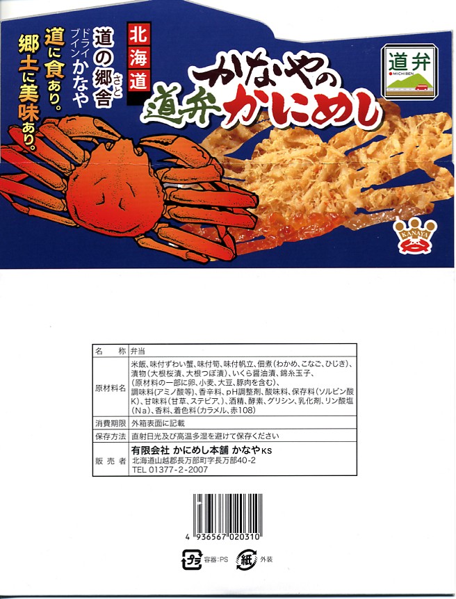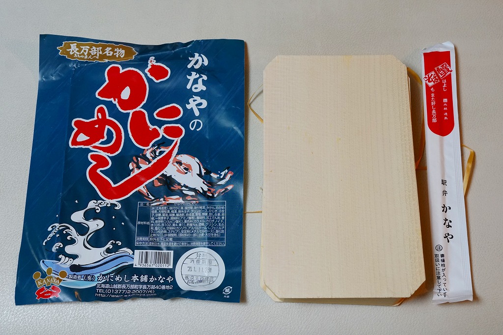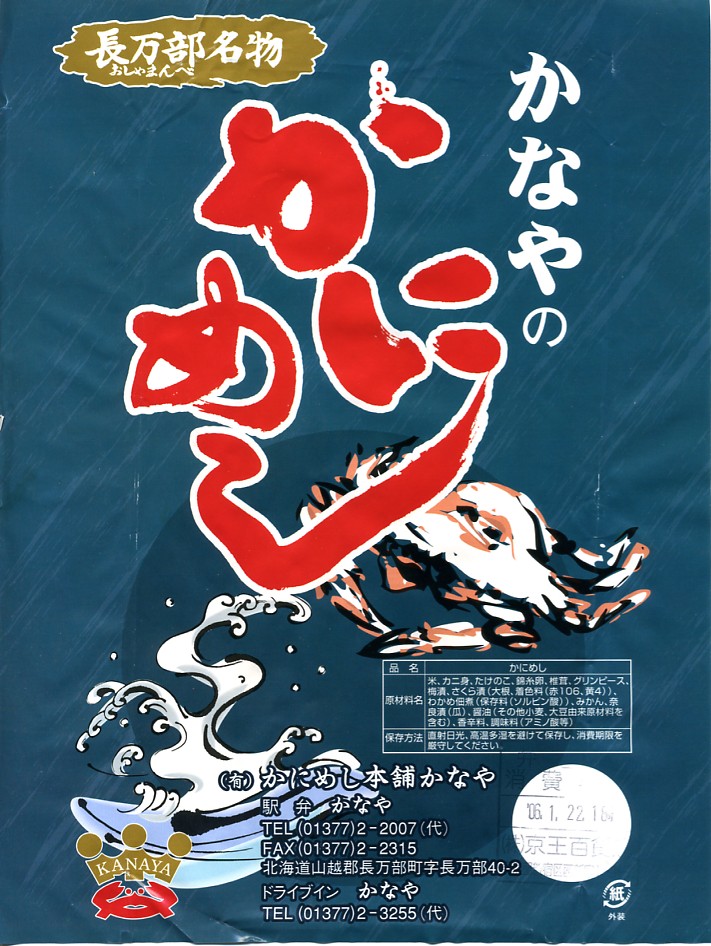 上記の駅弁「かなやのかにめし」の、2020(令和2)年時点での姿。デパートの駅弁大会での実演販売で購入したが、長万部の現地のものと変わらない。下記の2006年のものや、上記の2025年のものと、掛紙の法定表記を除き変わらない。