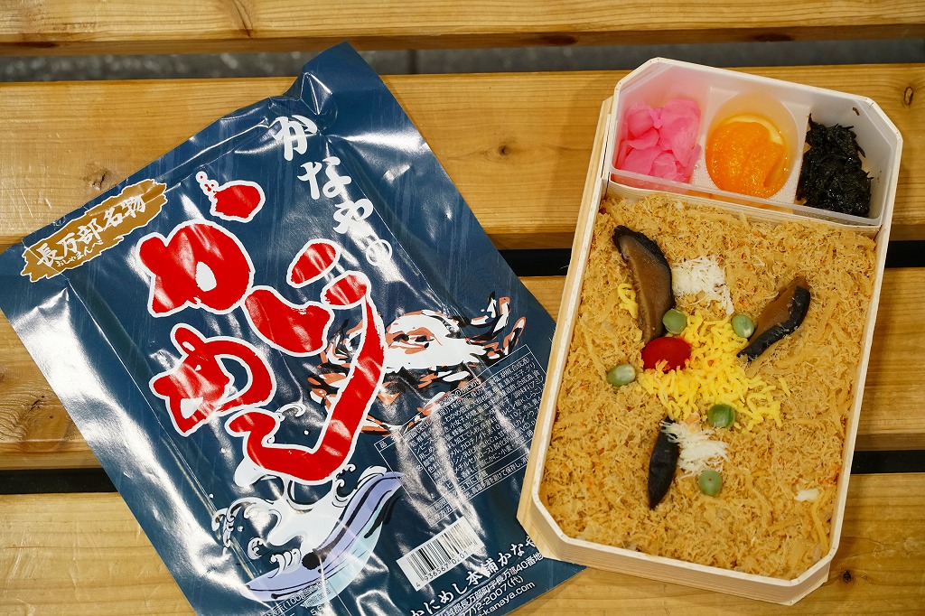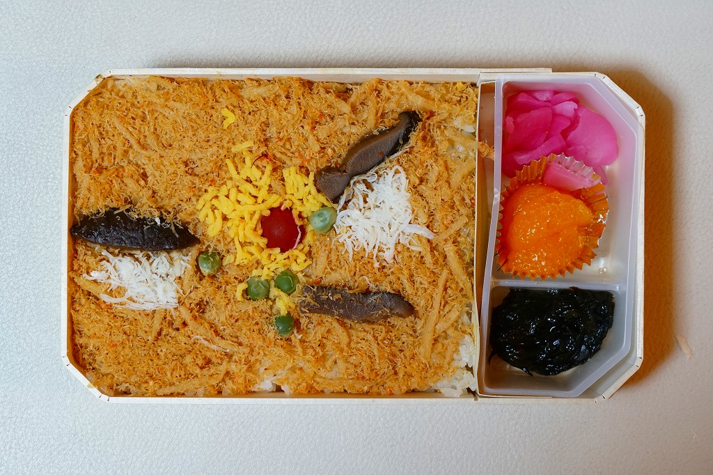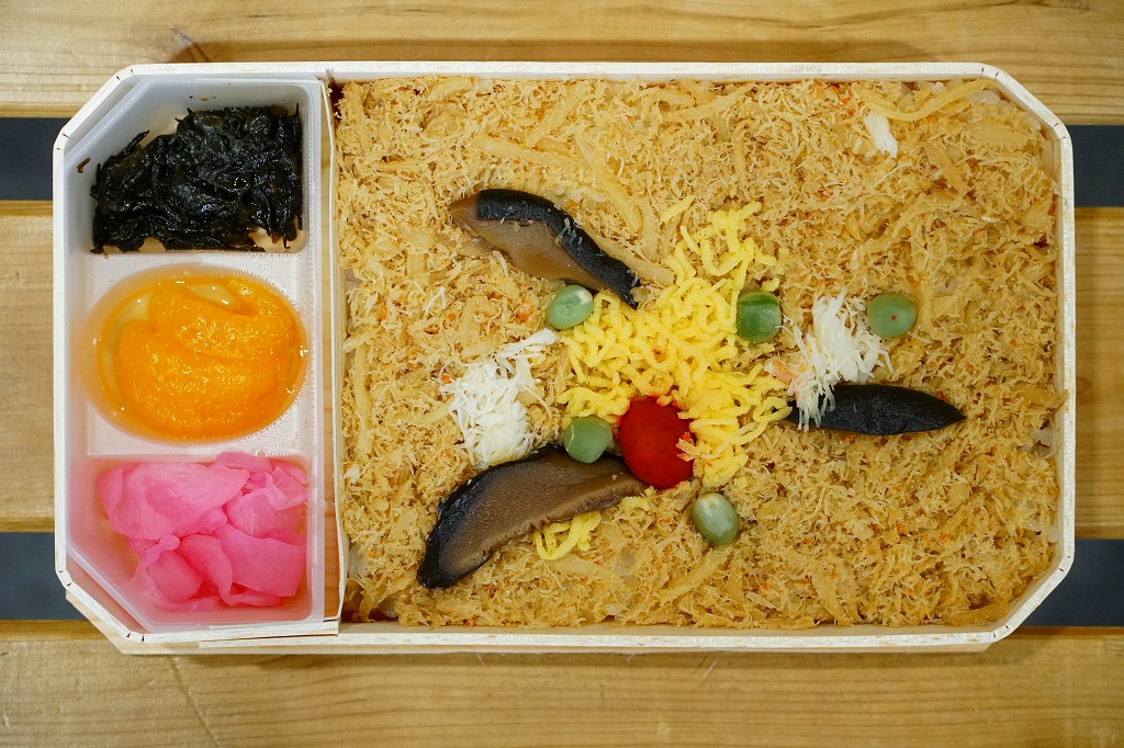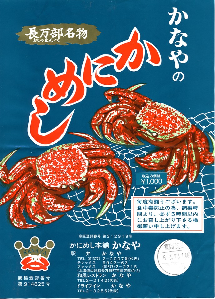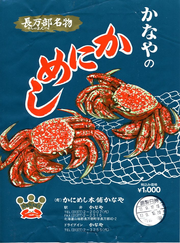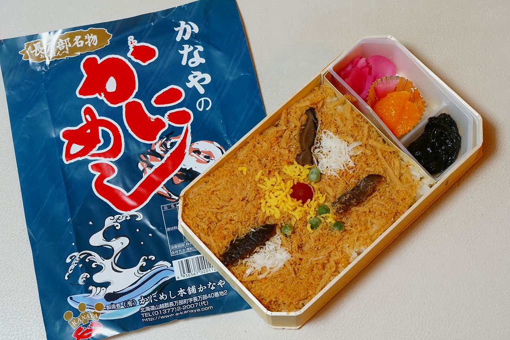 上記の駅弁「かなやのかにめし」の、2020(令和2)年時点での姿。デパートの駅弁大会での実演販売で購入したが、長万部の現地のものと変わらない。下記の2006年のものや、上記の2025年のものと、掛紙の法定表記を除き変わらない。