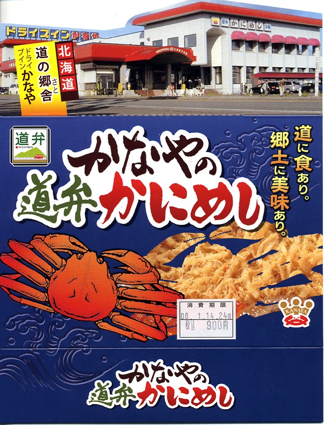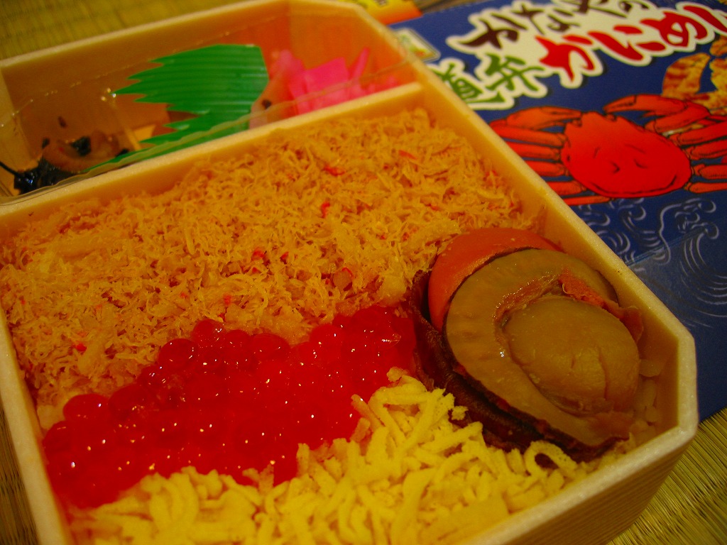 2007(平成19)年の秋までに投入された、「道弁」なる駅弁催事向け商品のひとつ。長万部駅弁のかにめしのように角を落とした、長方形の小さな容器を、スーパーやデパートの売り場での見栄えを重視した構造だと思える、立ち上がり付きのボール紙の枠にはめる。中身は白御飯の上にかにフレーク、イクラ、業務用冷凍錦糸卵、帆立をを乗せるもの。