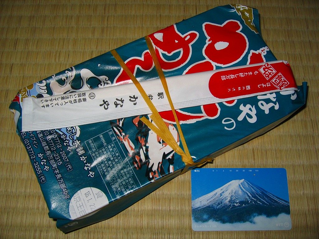 2004(平成16)年1月12日に購入した、長万部駅弁の掛紙。現地でなく、デパートの駅弁大会で買ったため、調製印は百貨店のものとなる。2年半前のものと比べて色調が変わり、食品表示と容器包装リサイクル法に基づく識別表示が右下に加わった。