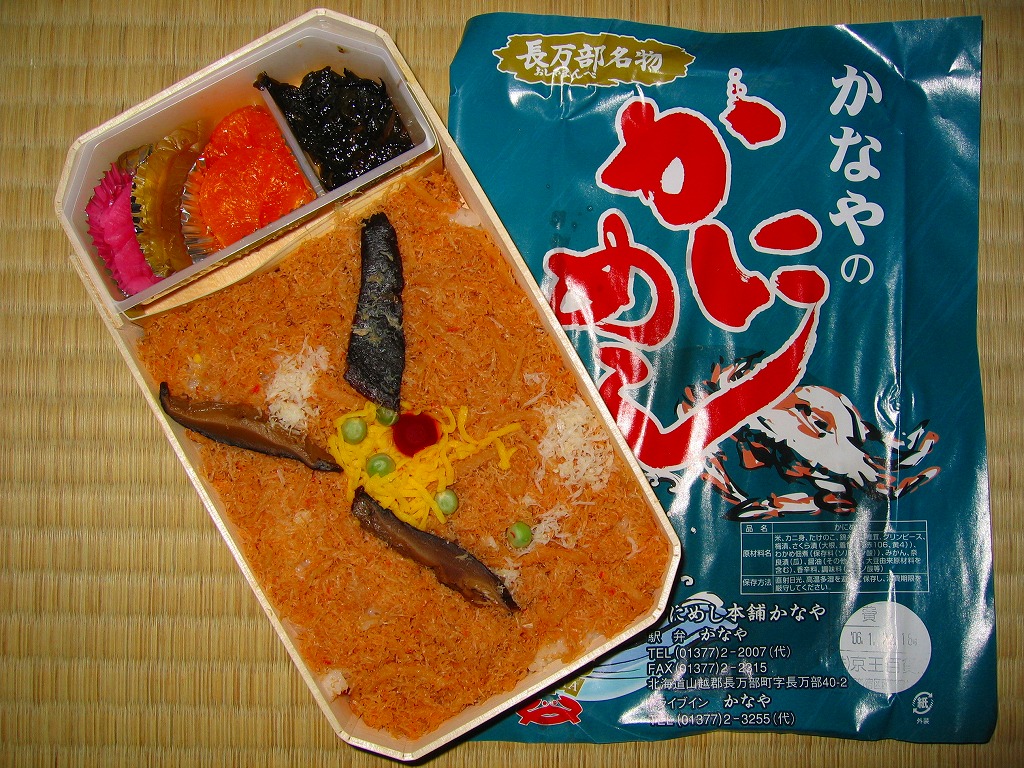 1950(昭和25)年に長万部駅で発売。昭和時代には全国に知られた有名な駅弁のひとつで、北海道を代表するカニ駅弁のひとつ。当時に夏の長万部駅のホームで売られた毛ガニの丸ゆでを弁当にしたものだという。容器は昔ながらの平たい経木折。これに駅弁の名前とカニを描いた青い掛紙をかける。中身は味付飯の上にタケノコ混じりのカニほぐし身を敷き詰め、錦糸卵、シイタケ、梅干し、グリーンピースで彩り、ワカメ佃煮、缶詰みかん、大根桜漬、奈良漬を添えるもの。価格は2006年時点で1,000円、2010年時点で1,050円、2014年時点で1,080円、2018年3月から1,180円、2024年時点で1,250円。