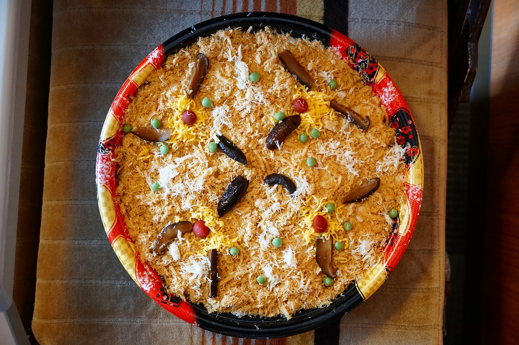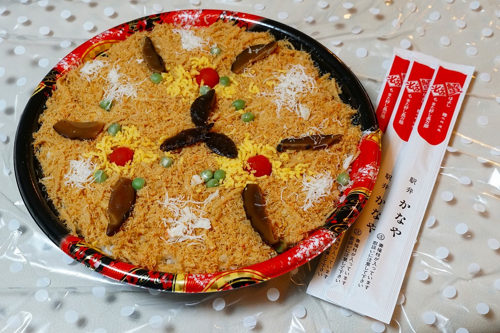 長万部駅の駅弁「かにめし」の4人前版。その姿は上記の3人前版から最大の6人前版まで変わらない。発泡材の容器が大きく、内容量も多くなり、具が4組になり、割りばしが4膳付く。計測したら総重量1.5キログラム。